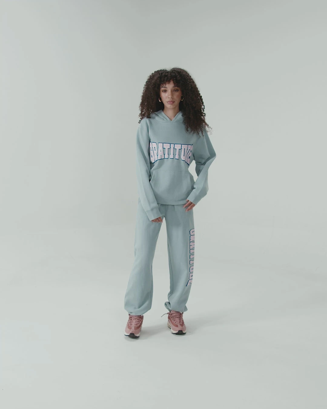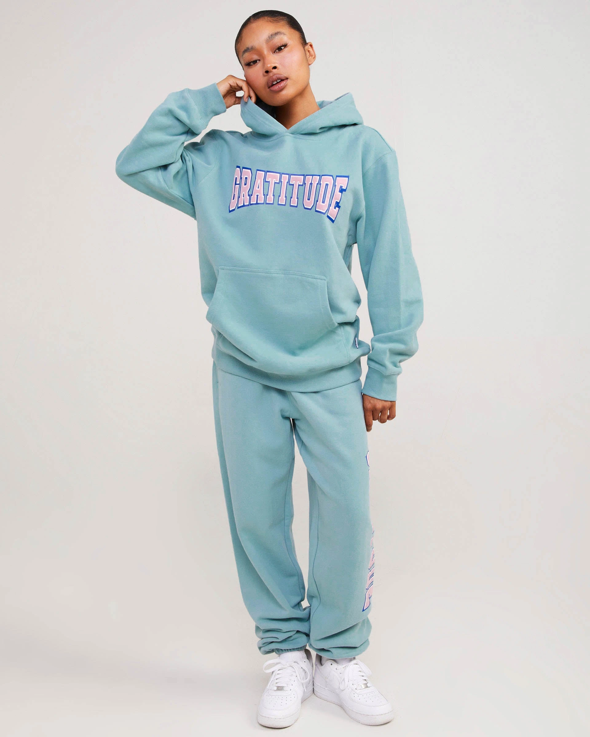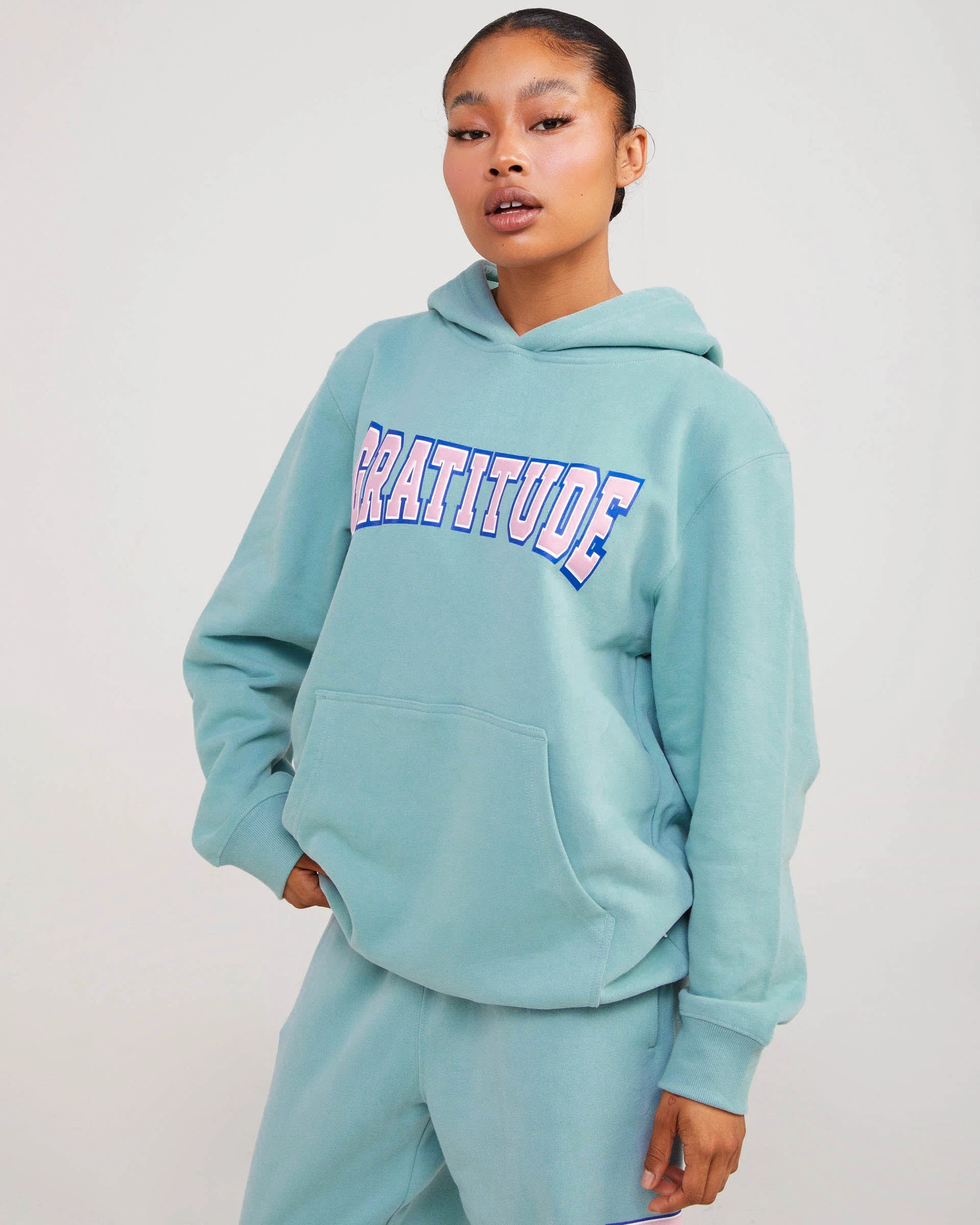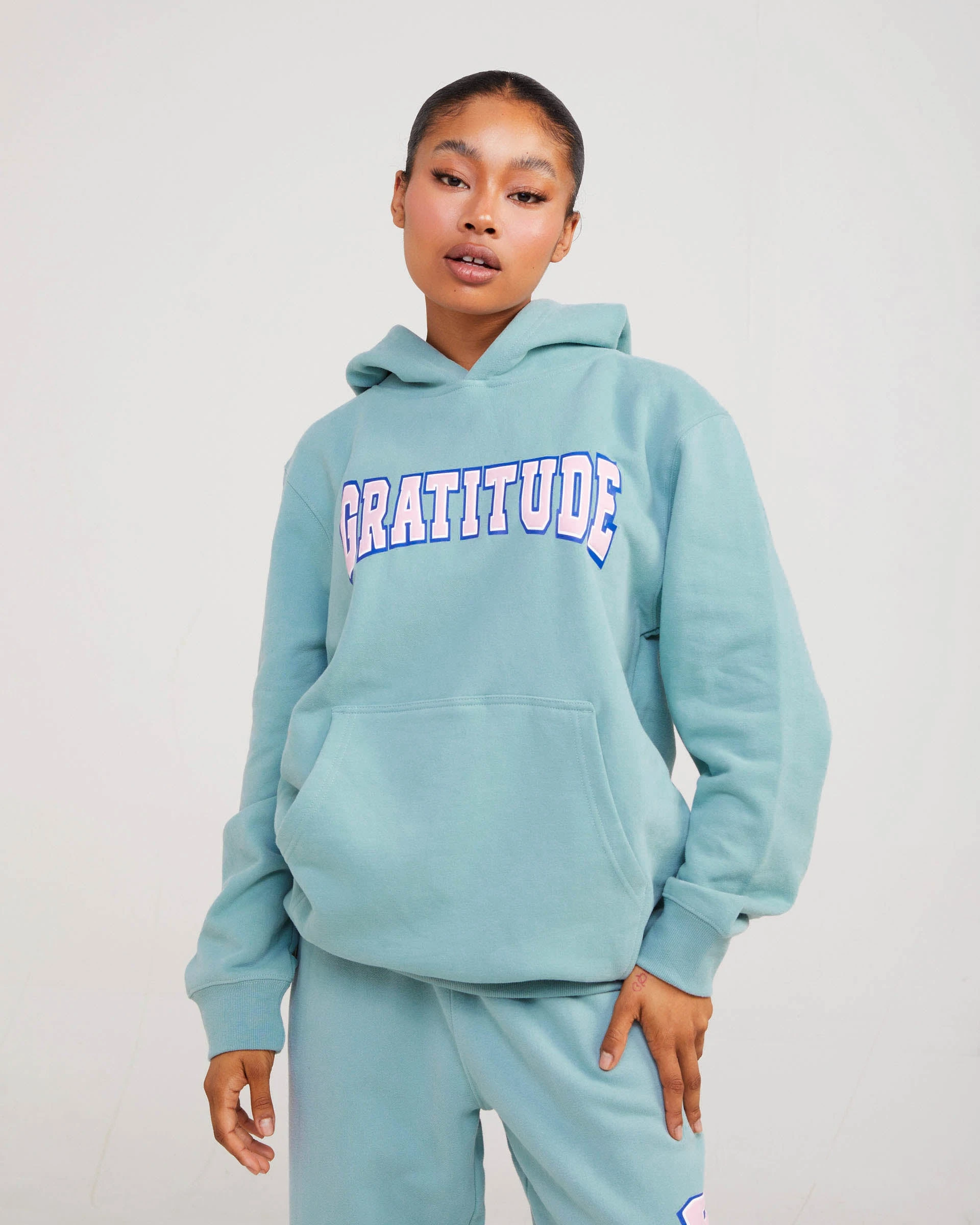 The gratitude hoodie is made from the softest blend of mid-weight fleece that is fitted to perfection. The hoodie features a puff print on the front chest that reads “gratitude” a kangaroo pocket in the front and a wide hood.
