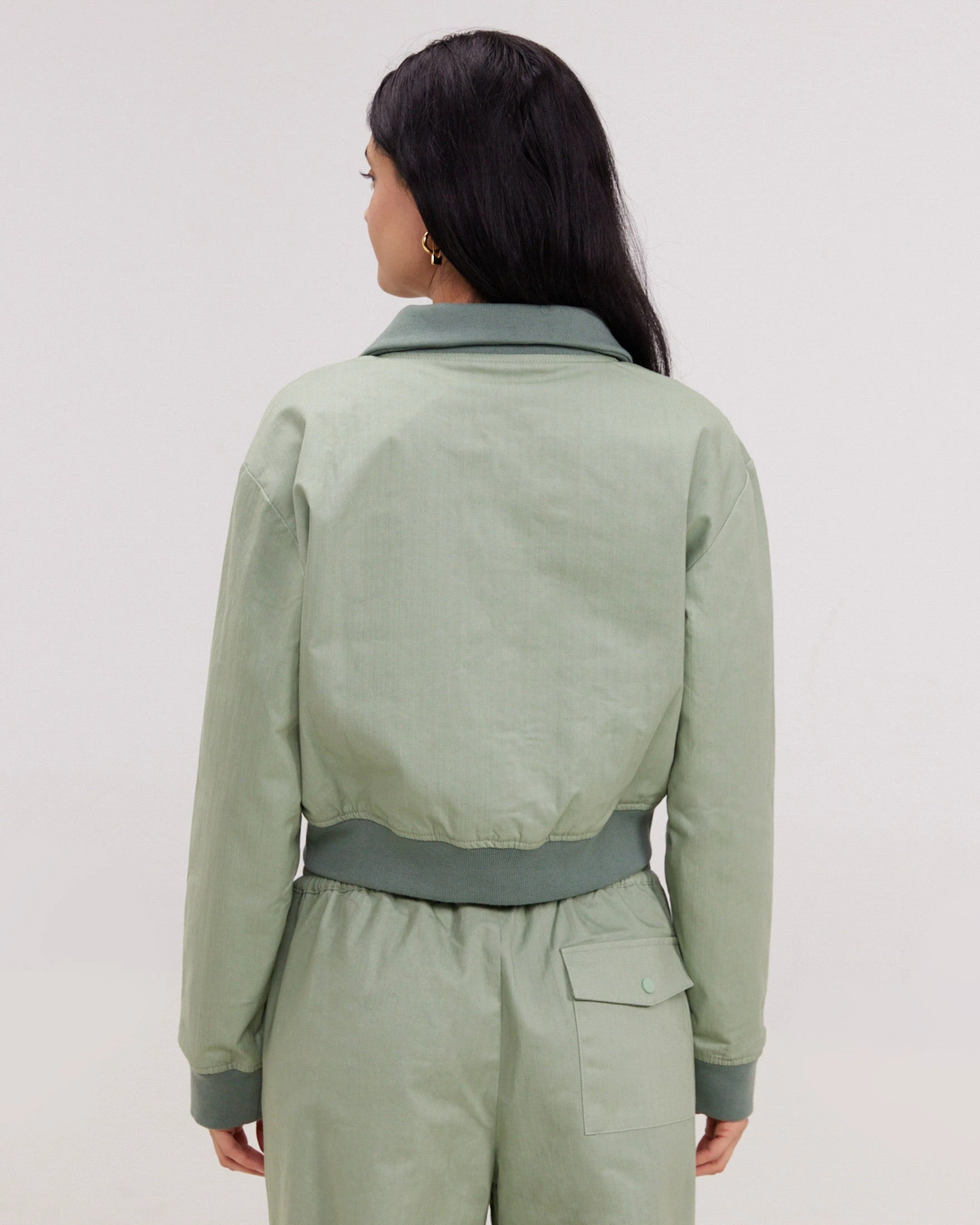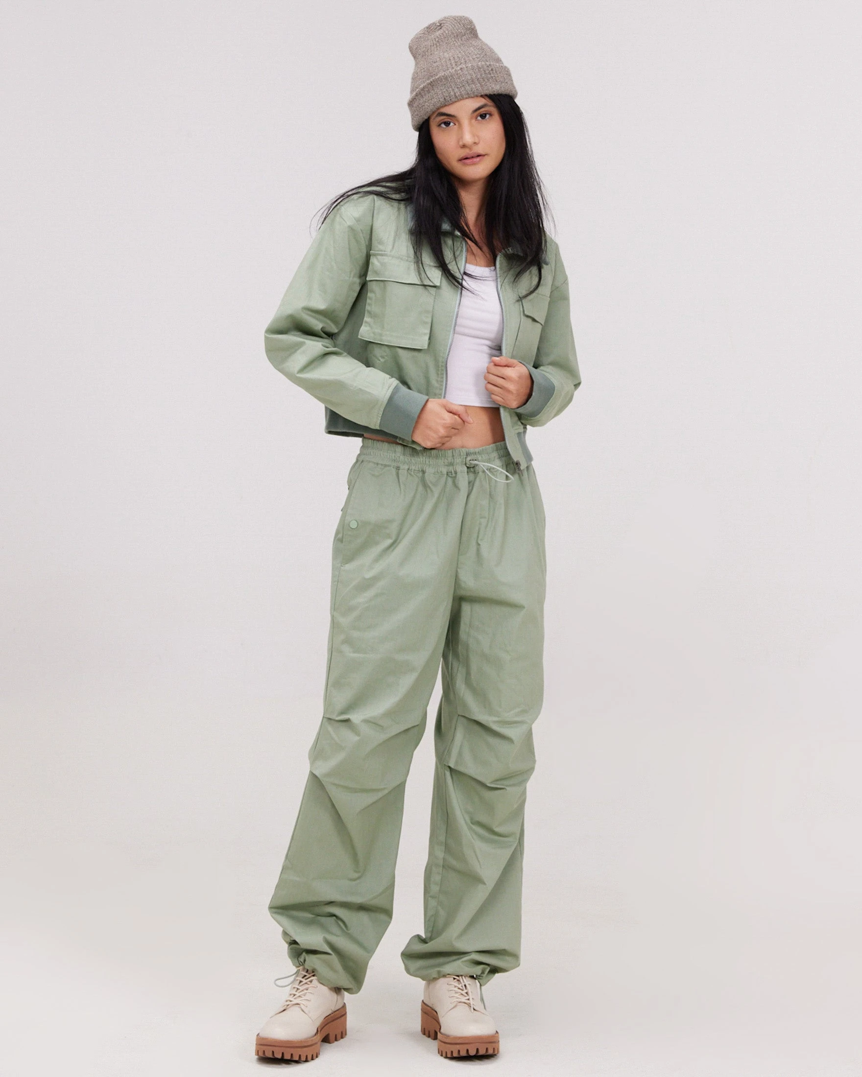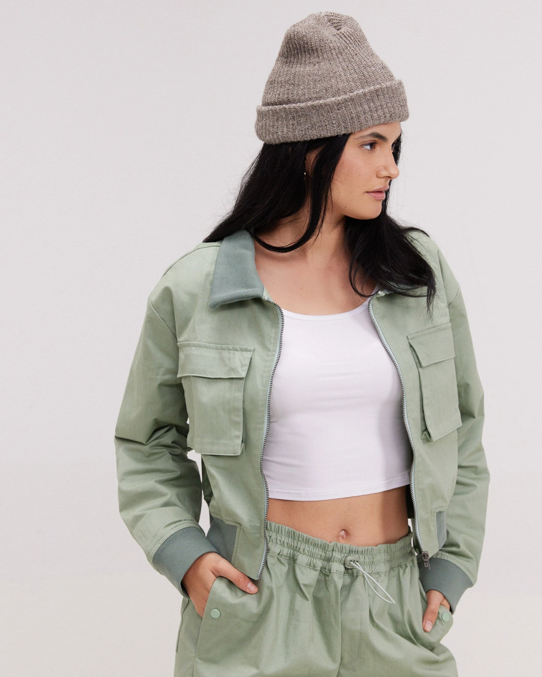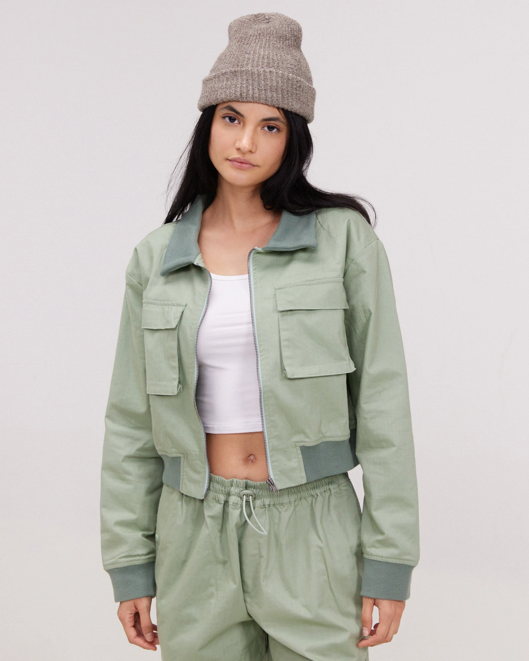 This utility jacket is not only cute but comfortable. The contrast trim gives the jacket dimension as the 3D pockets on the front chest add versatility to this piece. This jacket sits right at the waistband and matches perfectly with the Focus Utility Pant.