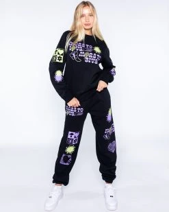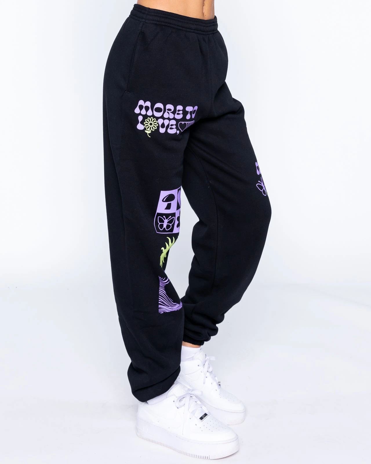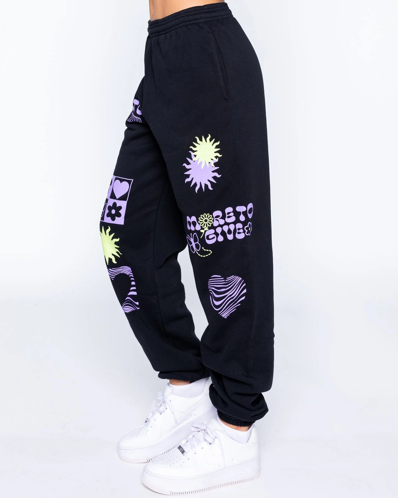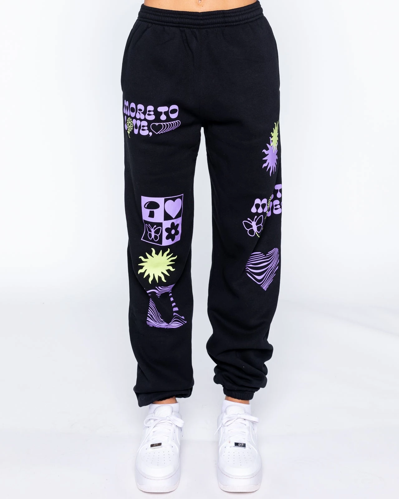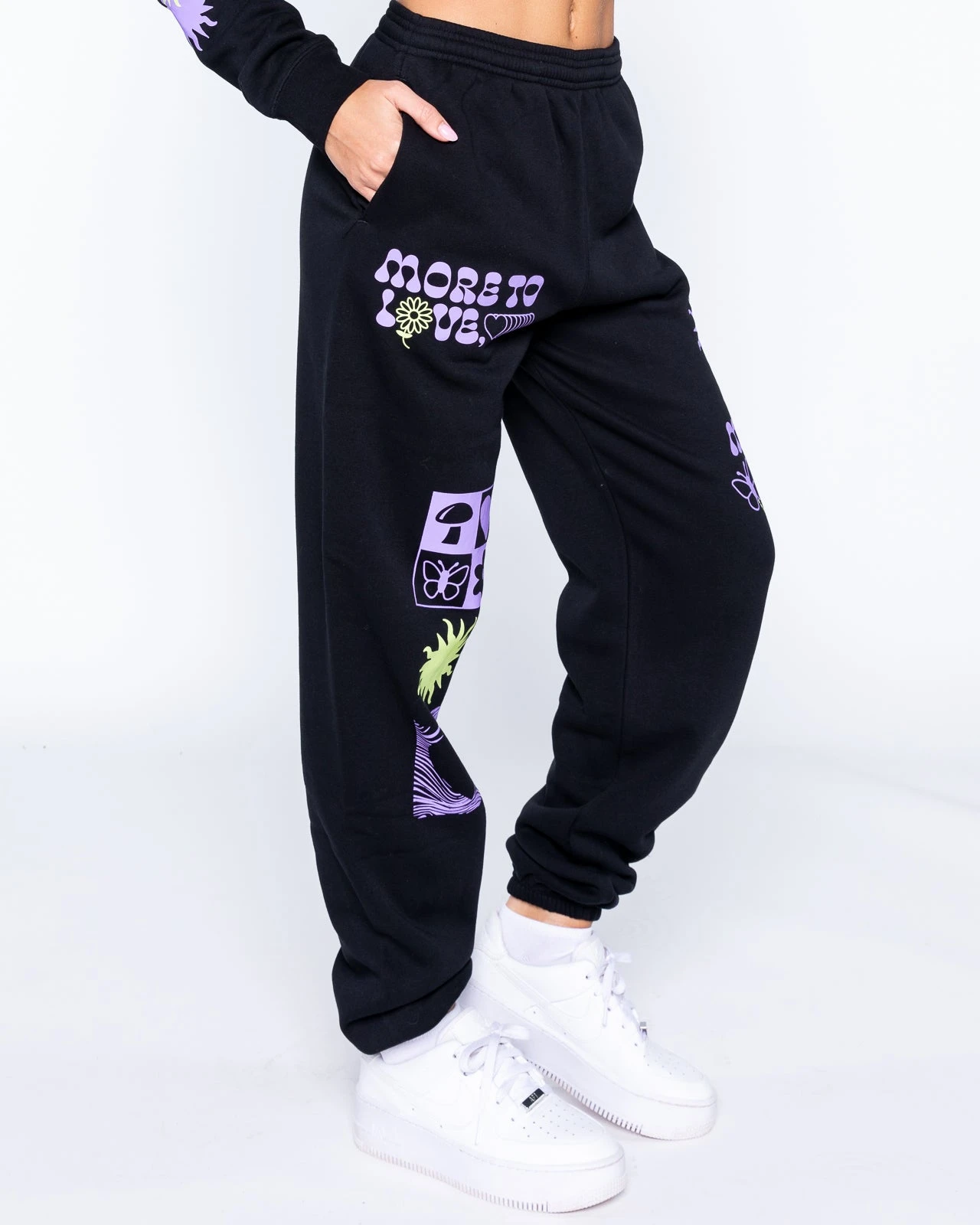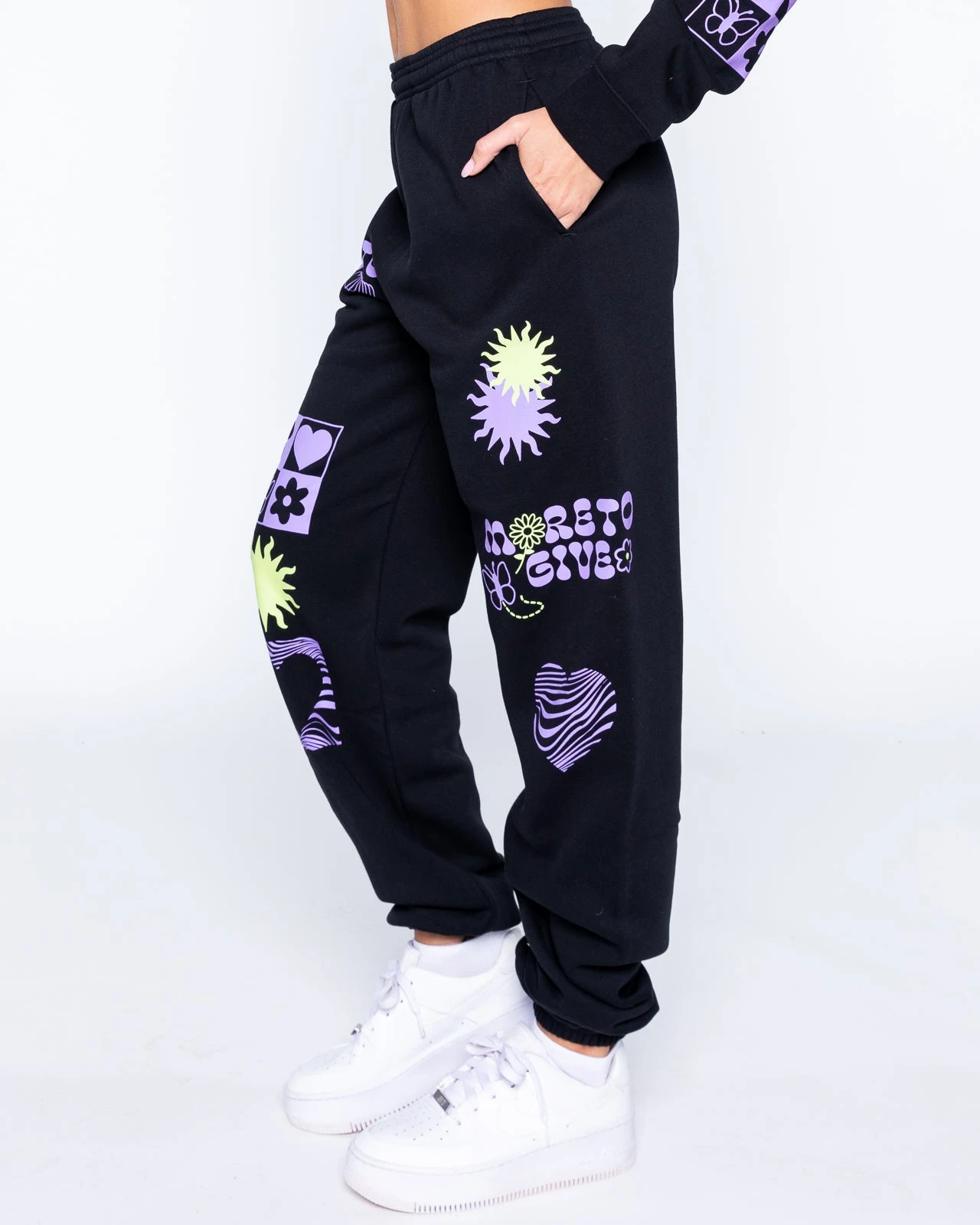 Keep it cute in these black sweatpants that have screen-printed designs on the front pant legs, Complete the fit with the matching black crewneck!