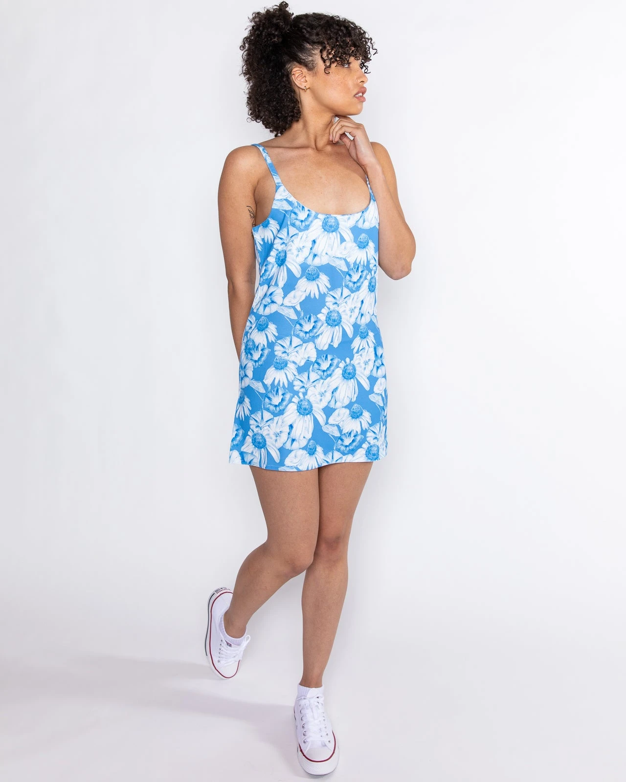 Step into SpringΒ in this floral dress filled with echinacea and morning glory flowers.Β Do yourself a favor and keep it casual or dress it up, either way, you are sure to have the best outfit for the season.Β The all-over print is part of an original painting by Dessie Jackson.