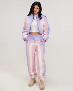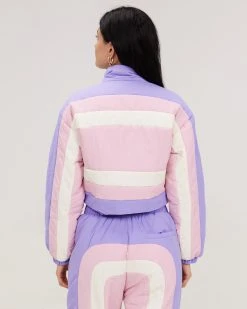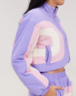 This cropped puffer jacket has pastel panels throughout, a cropped fit, a mock neck collar, and slit pockets for you to keep cozy.