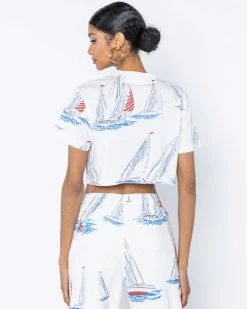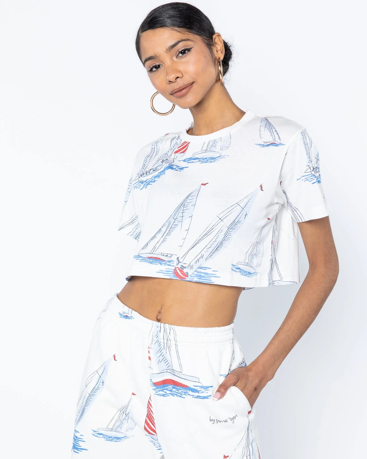 Sail away with us in this crop tee that features an original all-over print inspired by easier times spent on the open water. Feel the breeze this Spring in this tee & pair it with the matching sweatpants and bucket hat for a full coastal look.