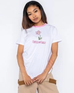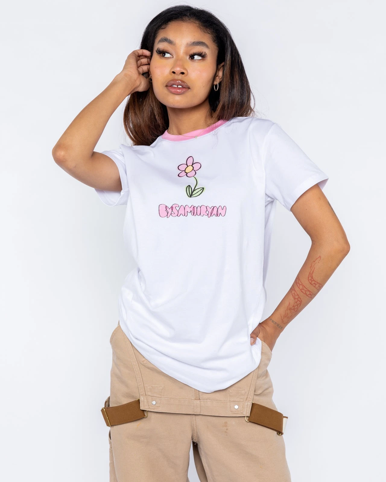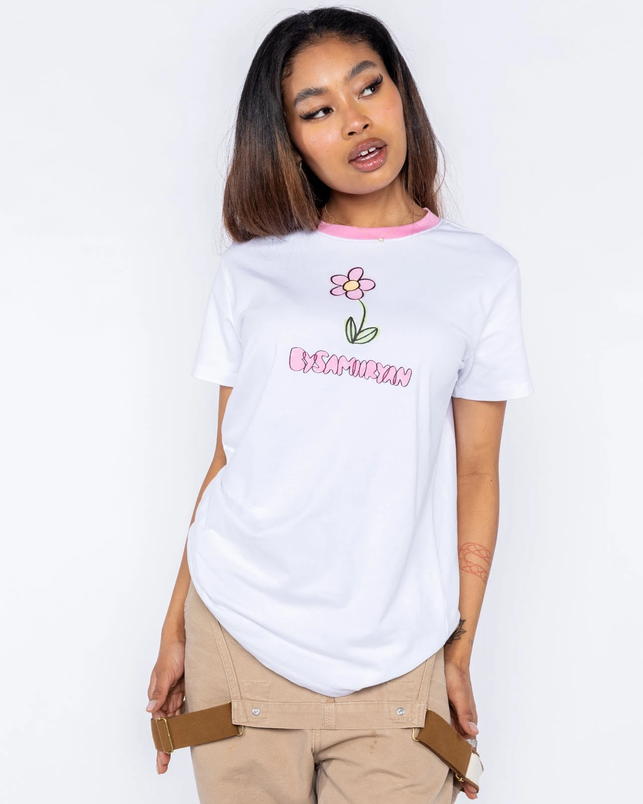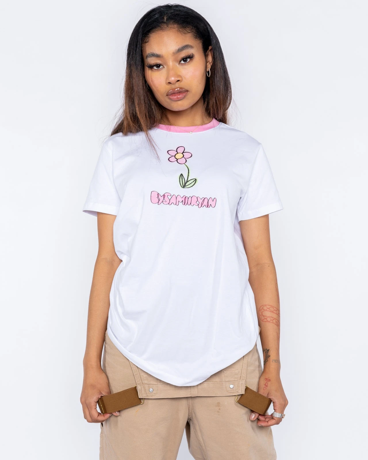 This super-soft tee has a contrasting pink collar and a hand-drawn print on the front chest.