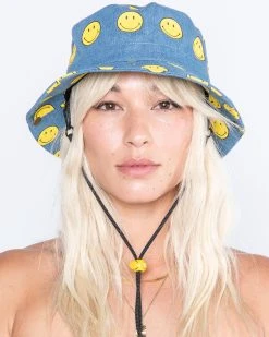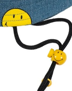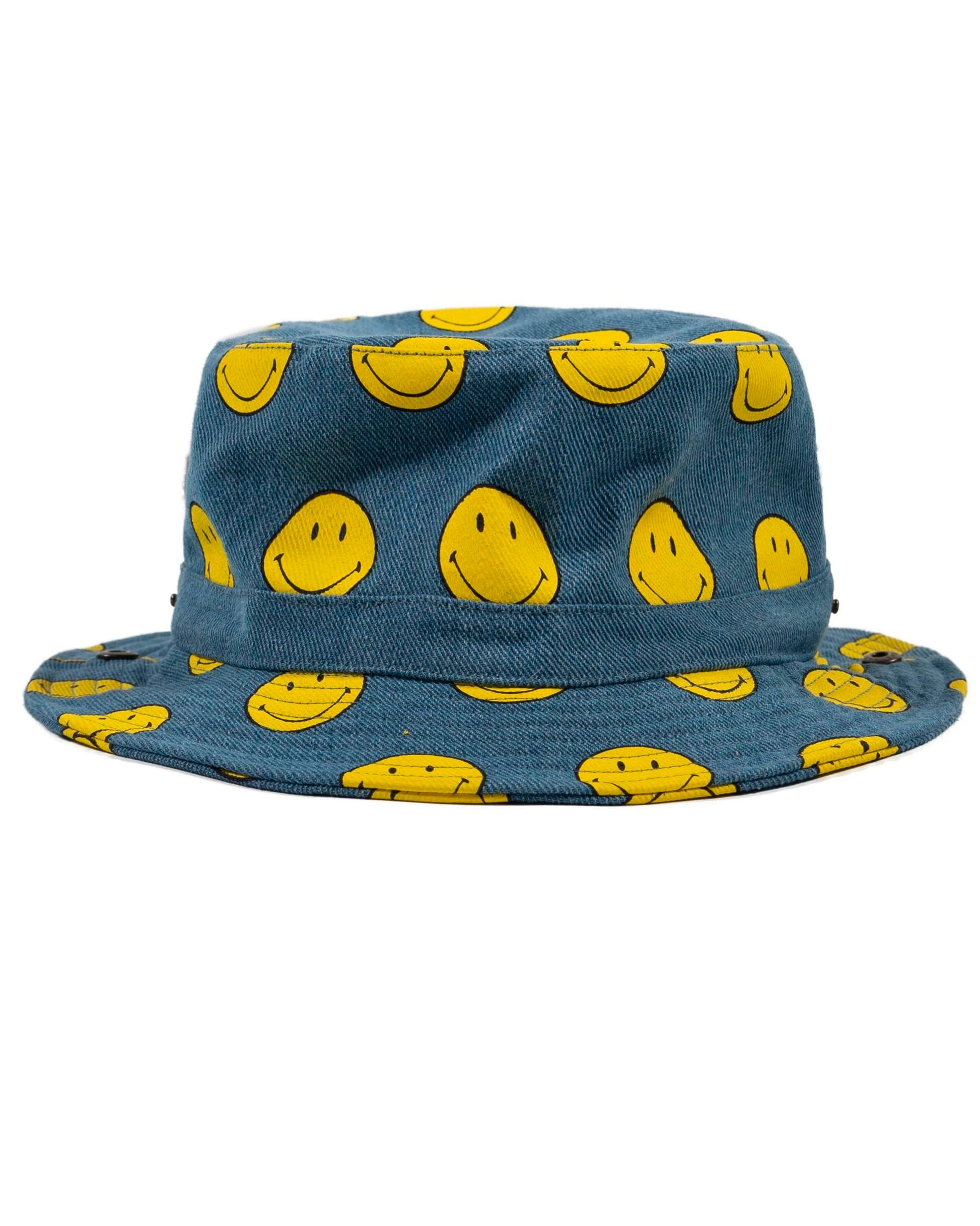 Keep the vibe happy, and the mood Smiley in this denim all-over print Smiley Boonie hat. This cute hat features button enclosures on the side to snap it up, and a drawstring with an adjustable customized Smiley bead.