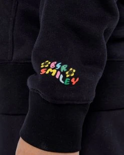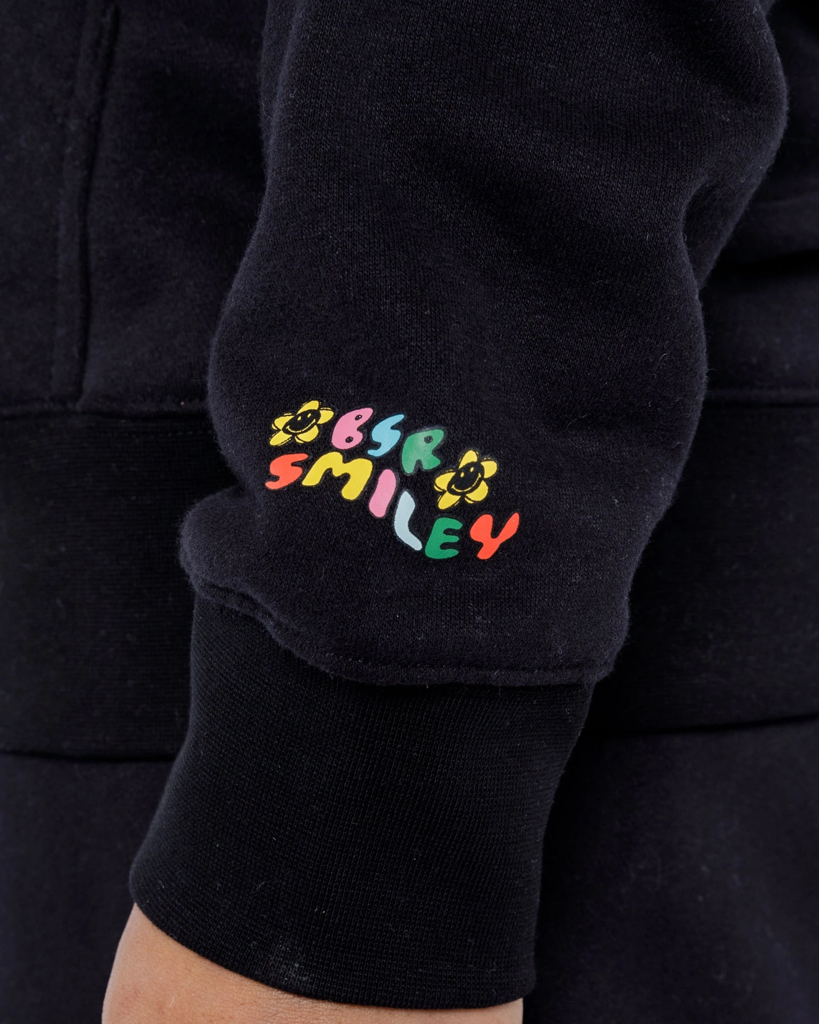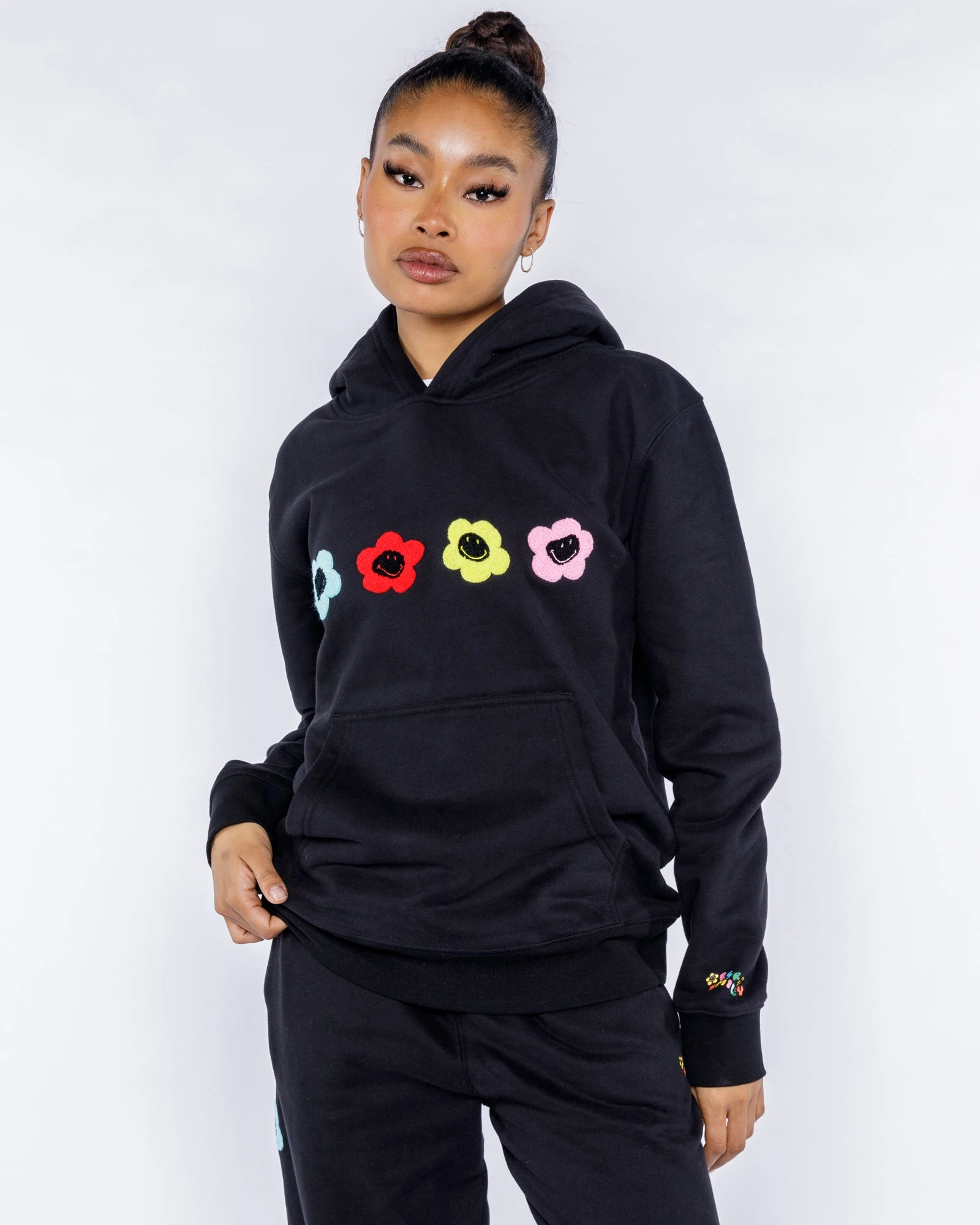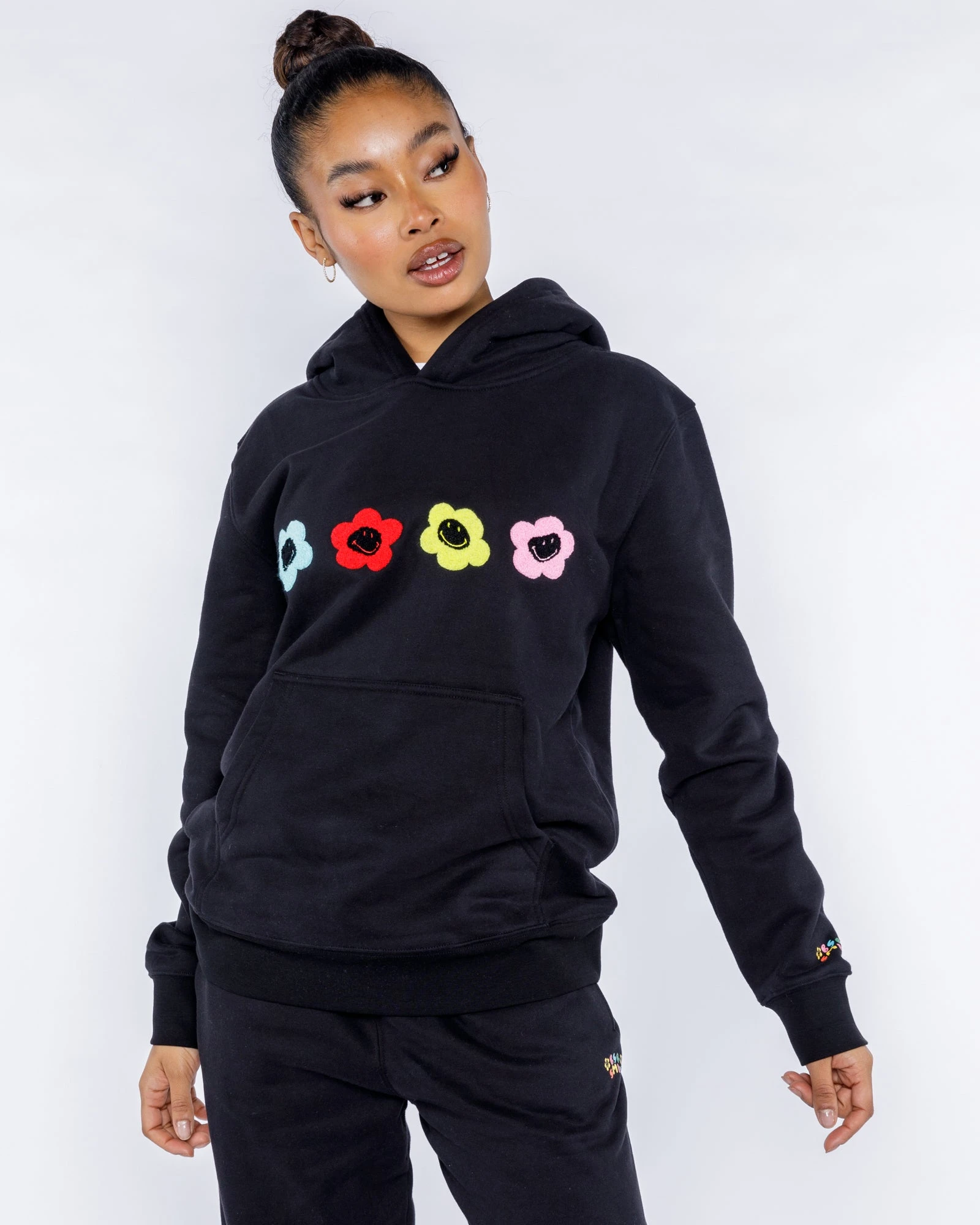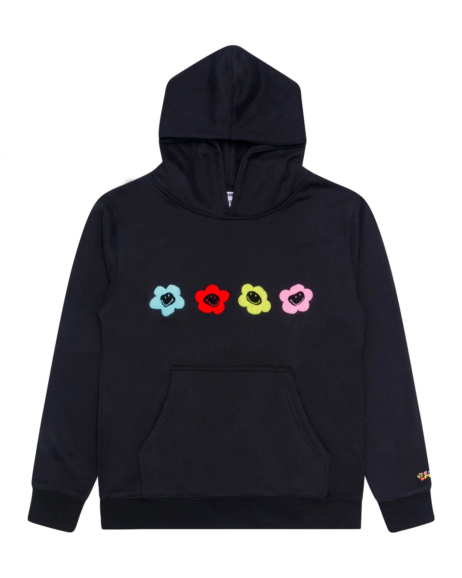 Caution, this will be the softest hoodie you’ll ever wear. We created our own blend of the softest fleece fabric to make this hoodie and trust us, you’ll never want to take it off. There are colorful smiley daisy chenille patches on the front chest, a kangaroo pocket in the front for all your things, and our screen-printed logo on the wrist.