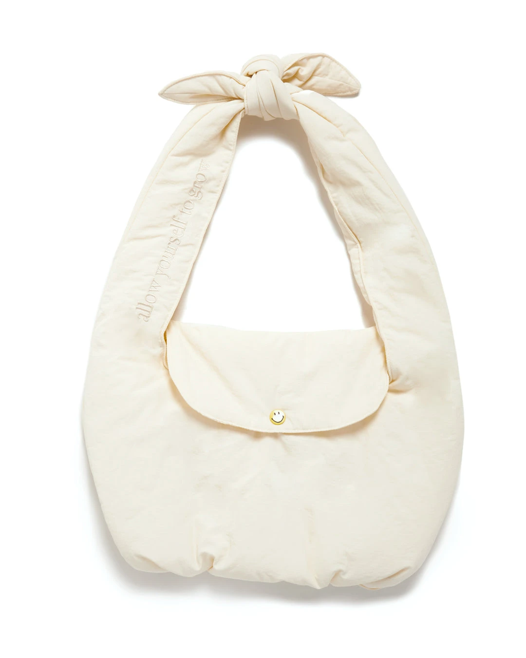 Allow yourself and all your needs to grow in this bag. We created the most perfect nylon bag that is not only cute but functional! The inside and the outside have the most perfect Smileyยฎ snap enclosure and the tonal embroidery on the strap serves as a message to always remind you to leave yourself room to grow.