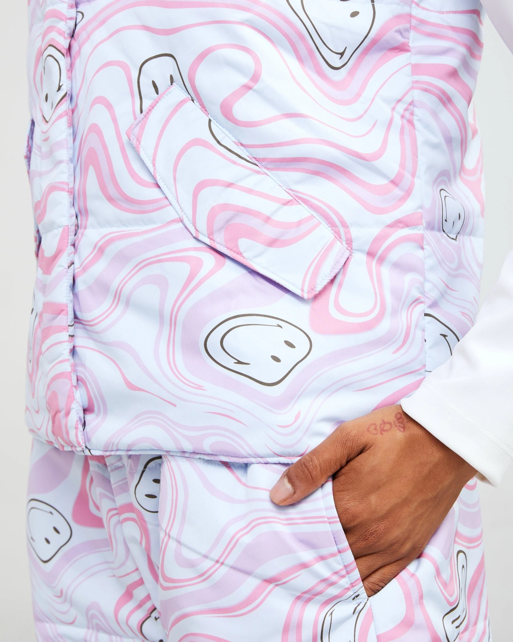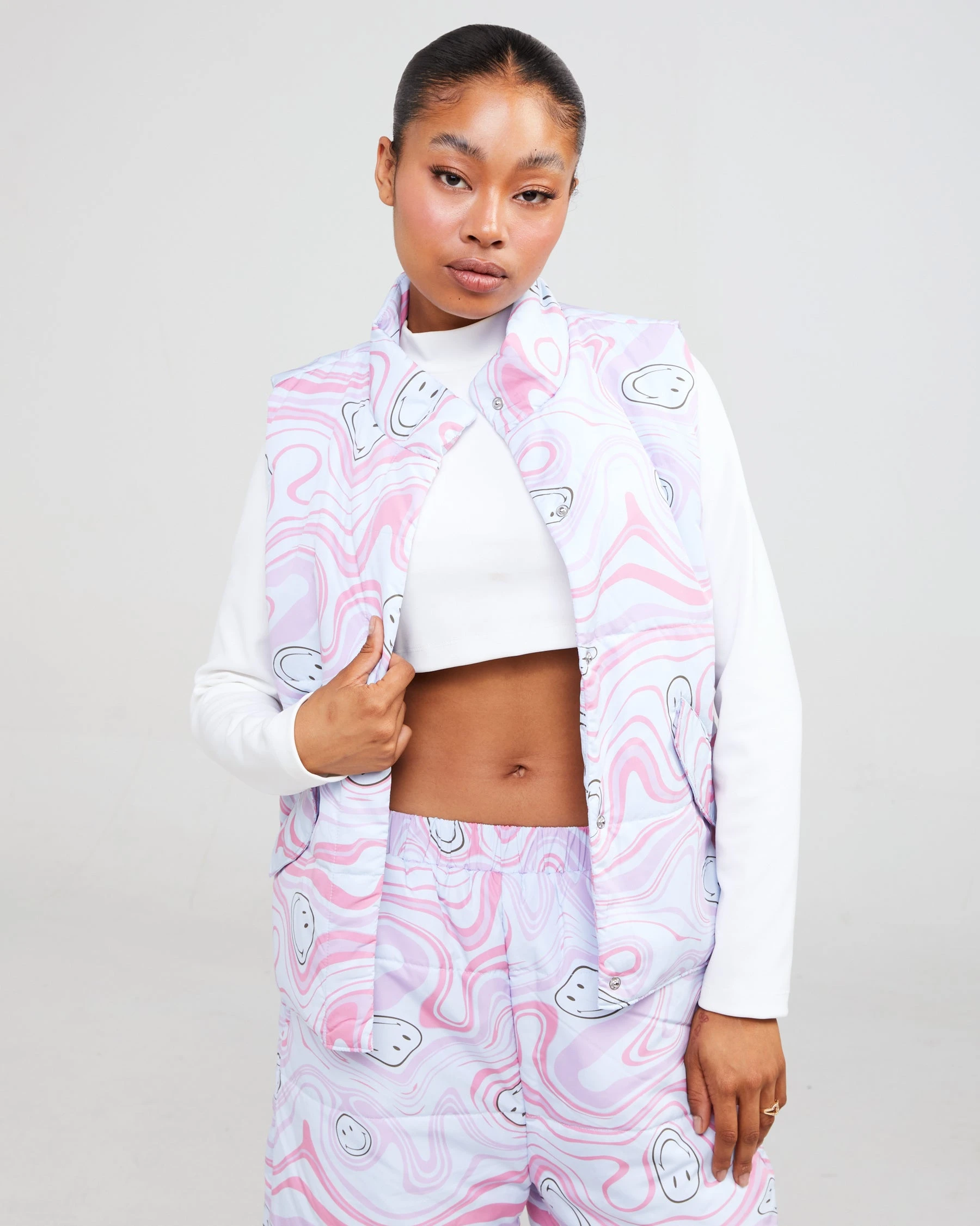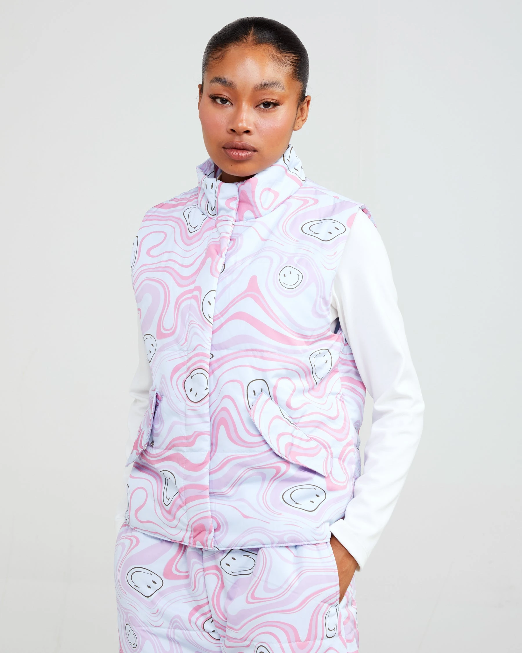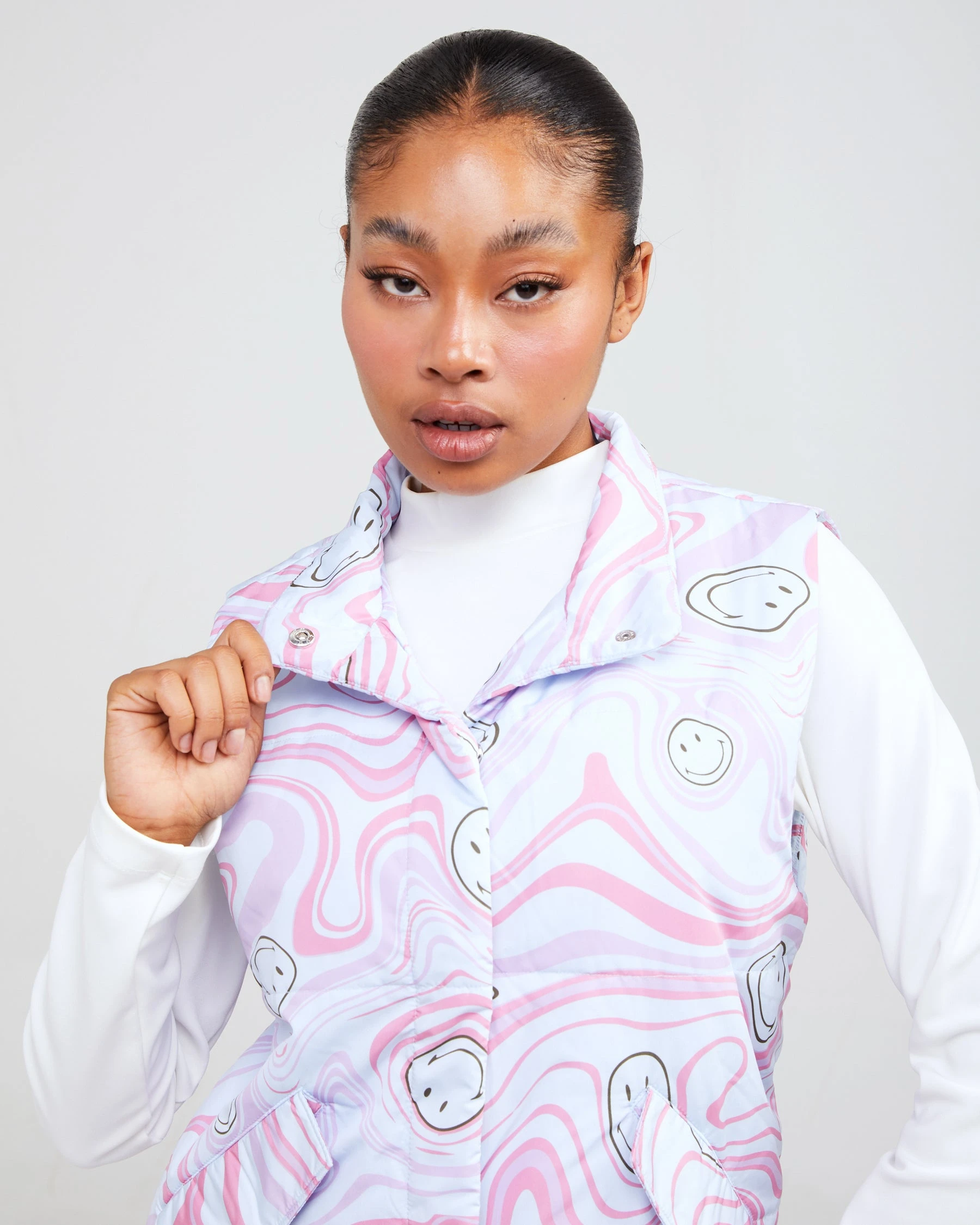 Theย Smiley Trip puffer vest is made from soft nylon fabric featuring a mock neck and a rubberized logo on the chest. The pockets and center include snap enclosures.ย