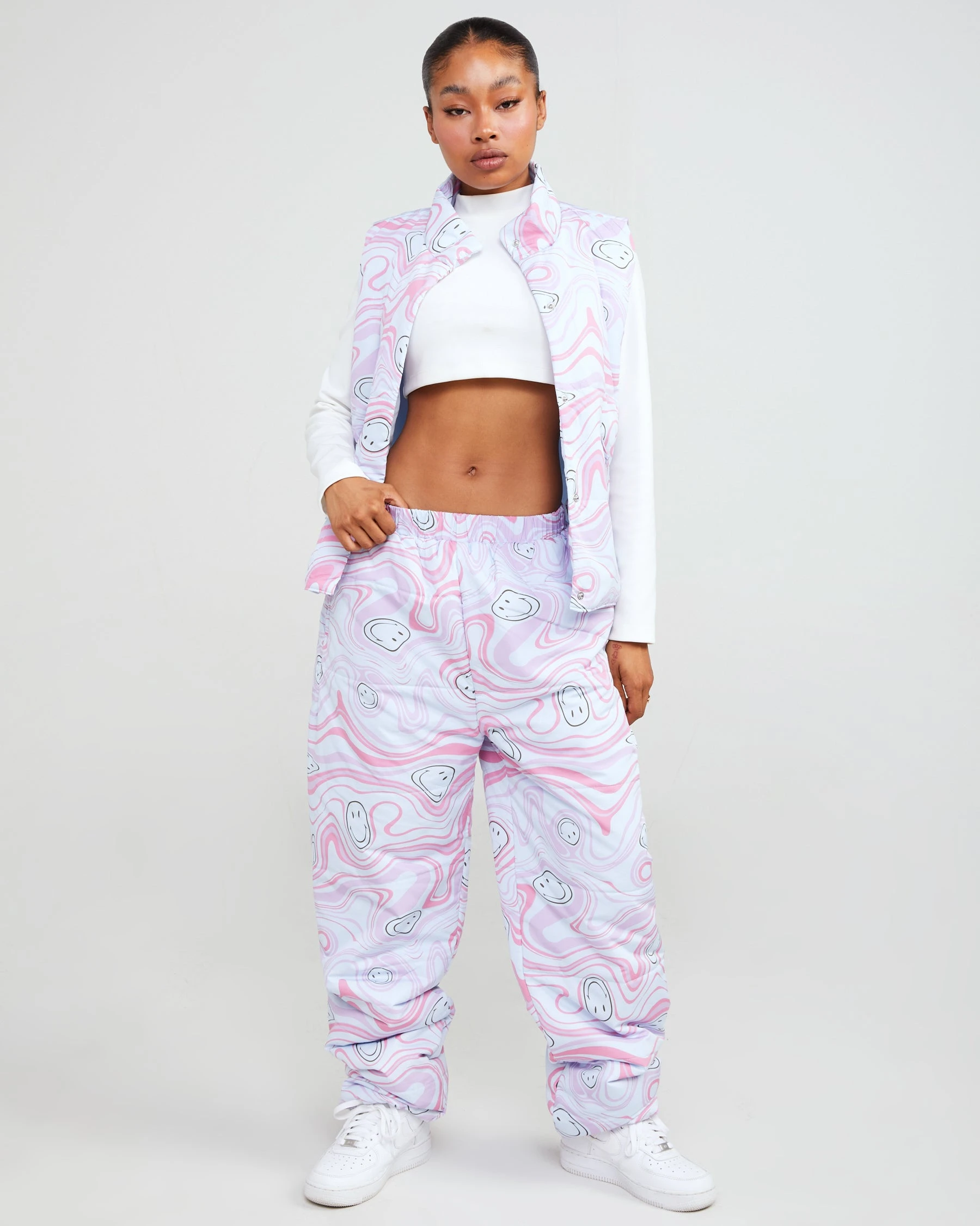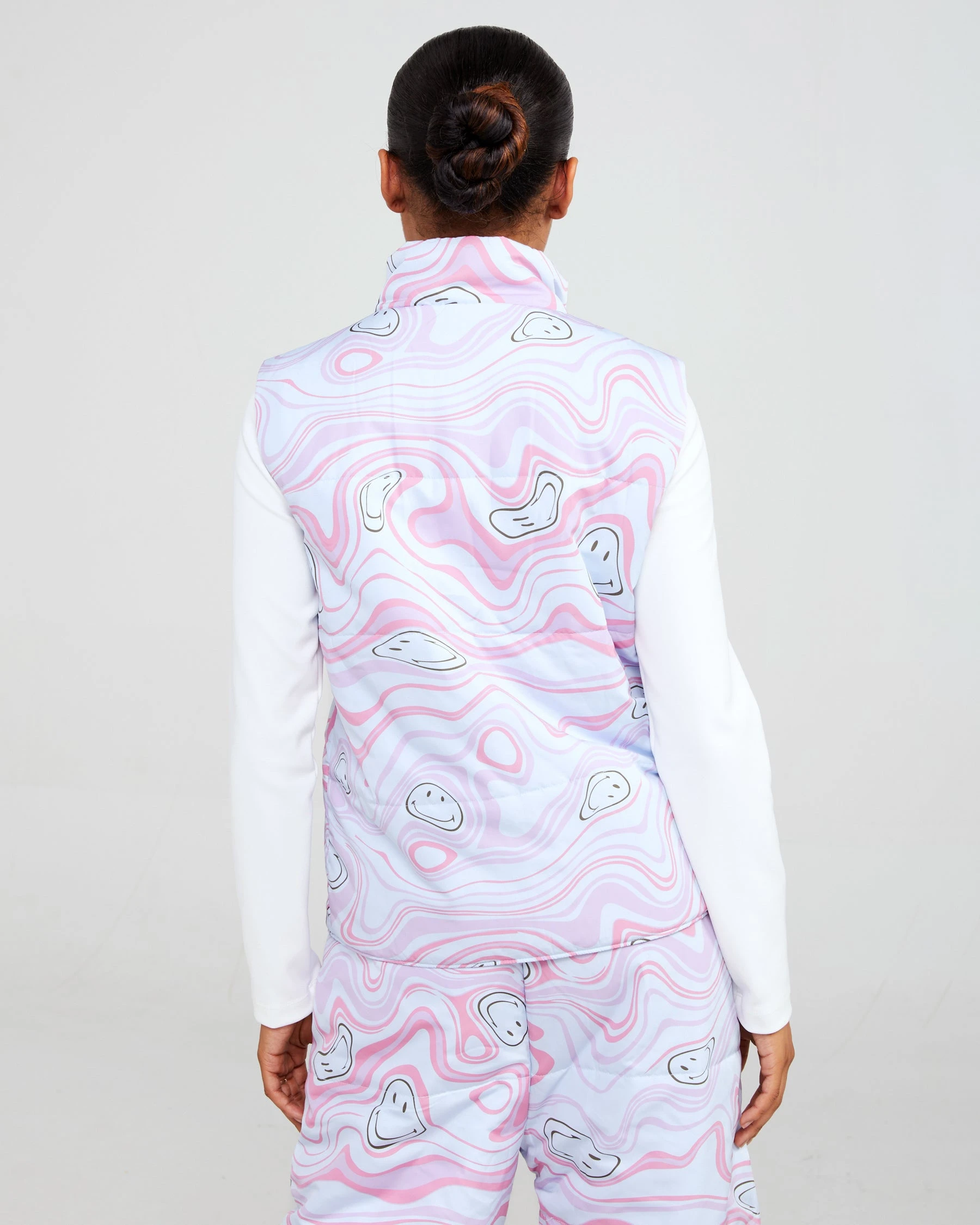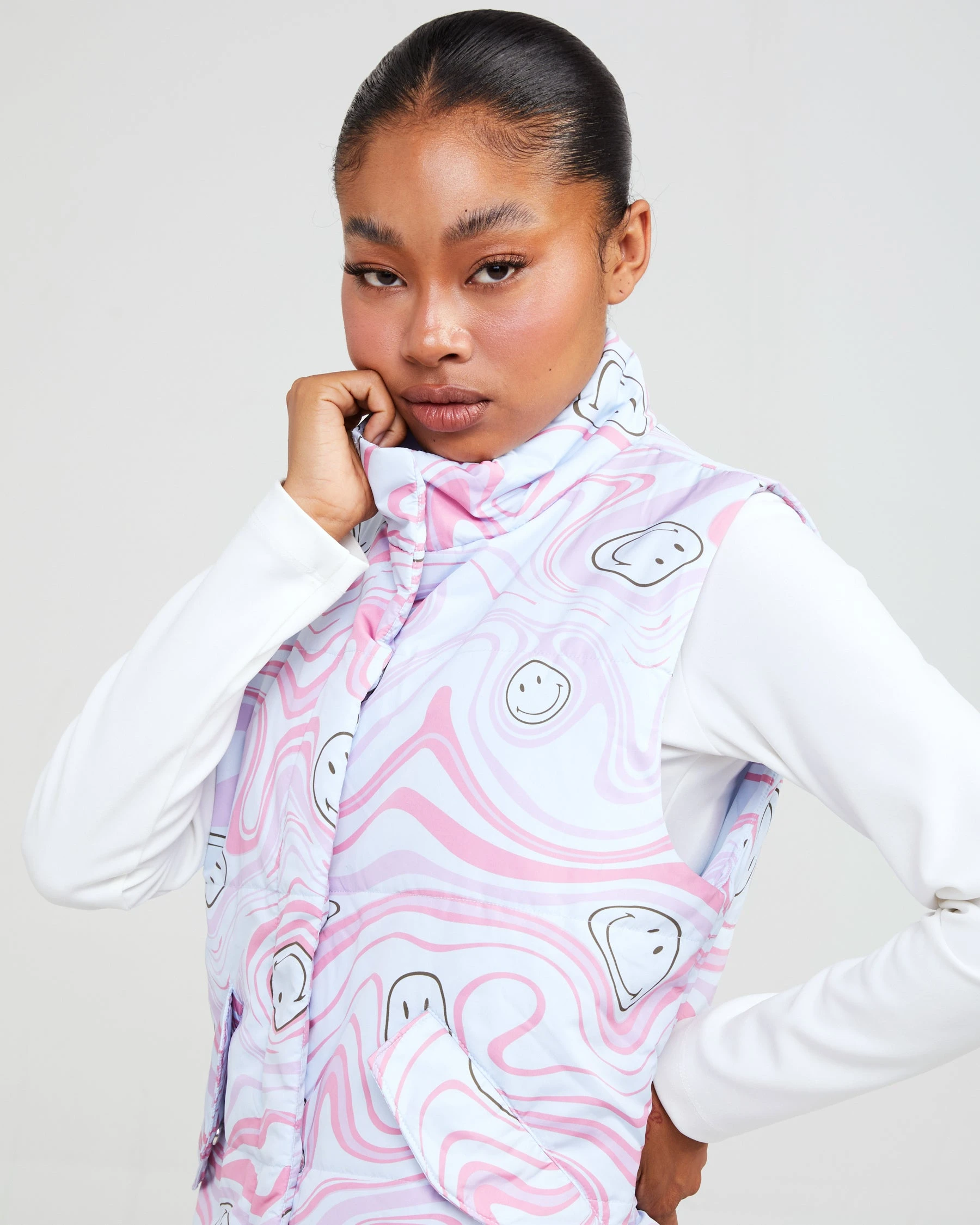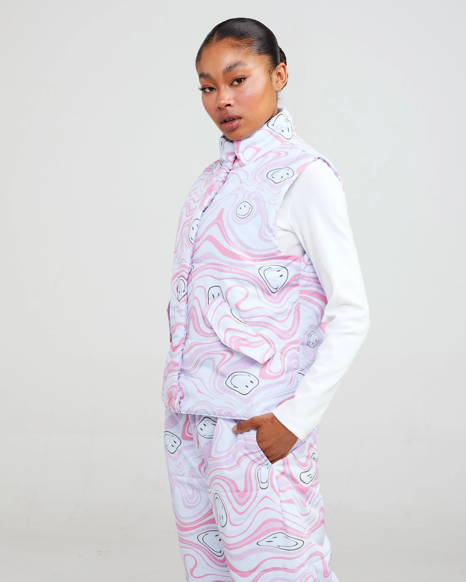 Theย Smiley Trip puffer vest is made from soft nylon fabric featuring a mock neck and a rubberized logo on the chest. The pockets and center include snap enclosures.ย