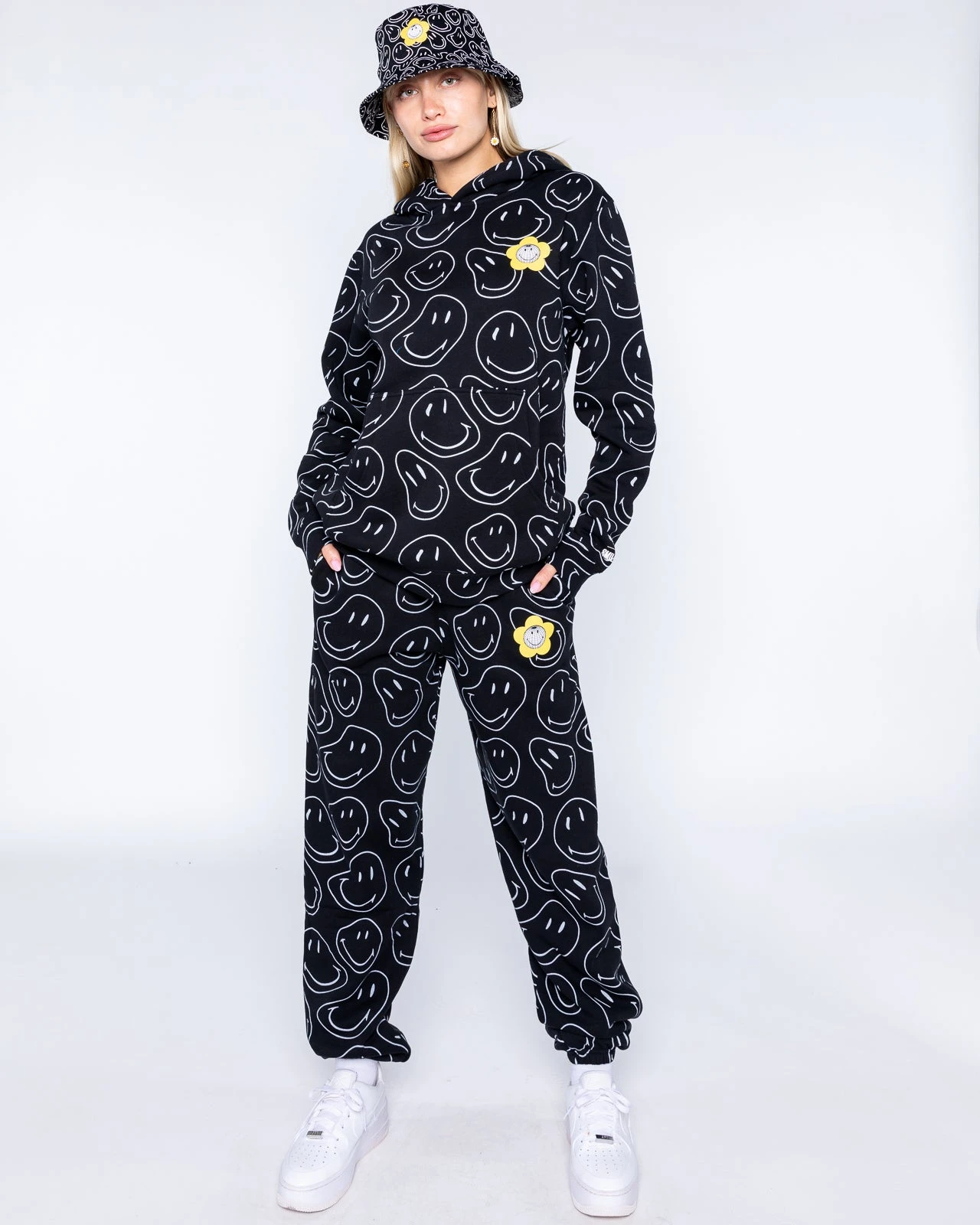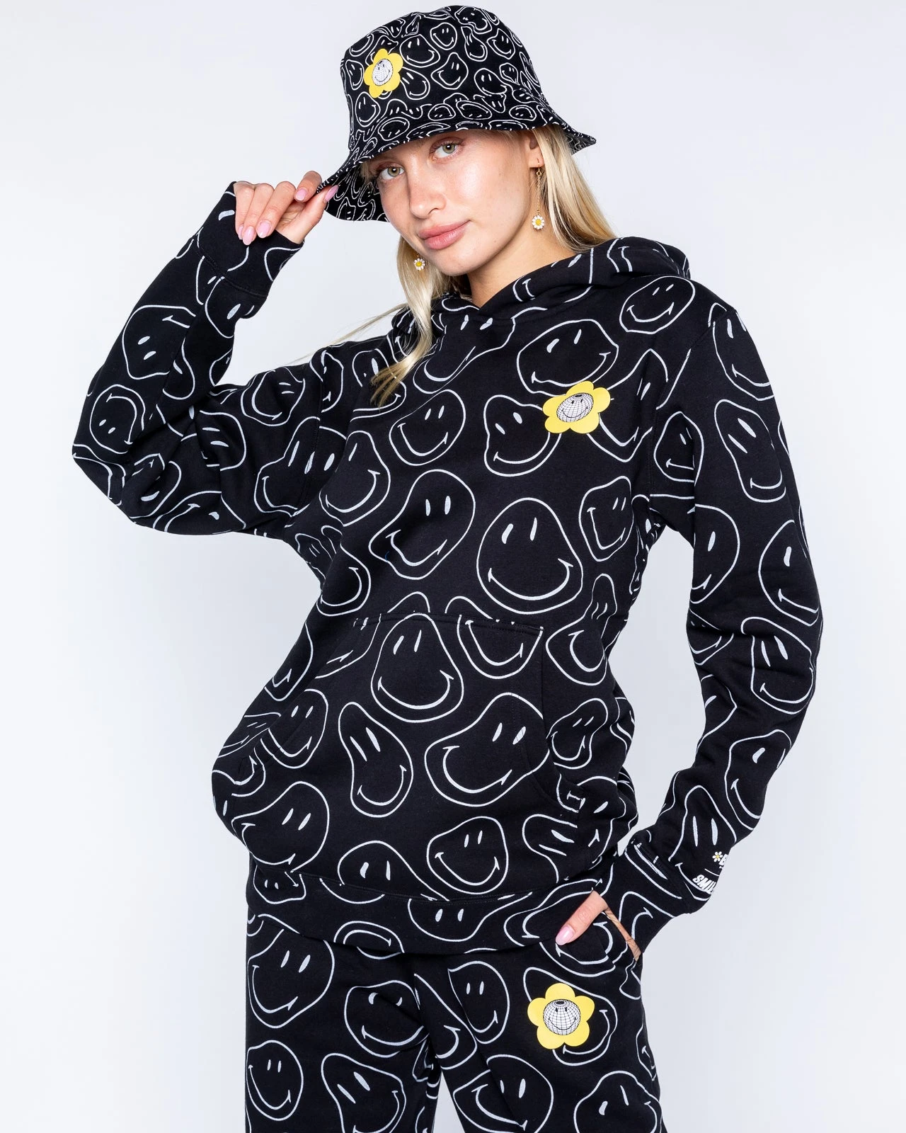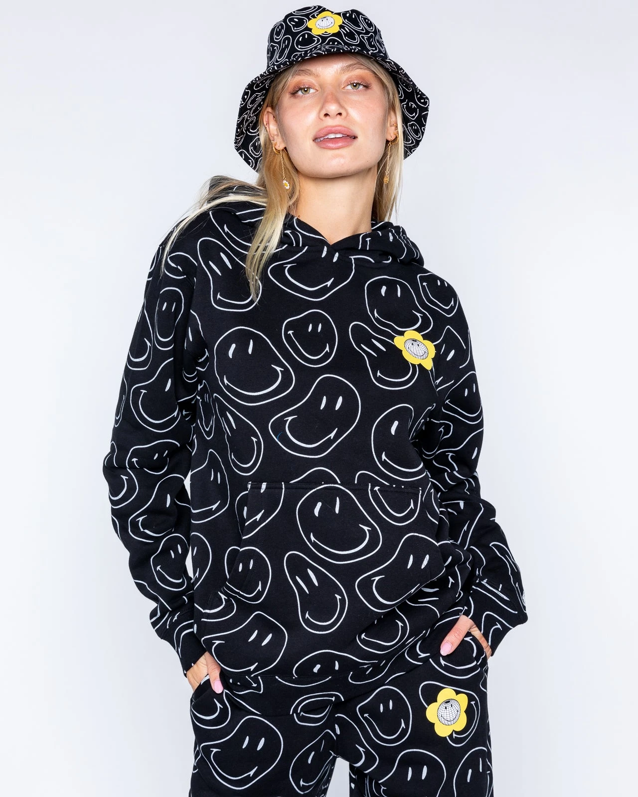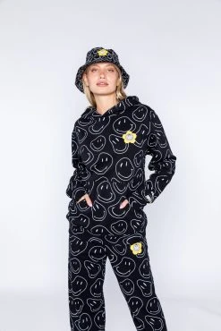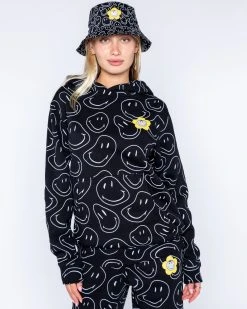 Bringing all the smiles into the universe. Show the positive vibes all over in this soft all over print hoodie with warped smilies all over and a screen printed design on the left chest.