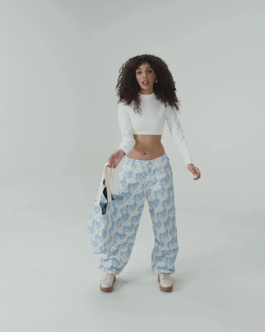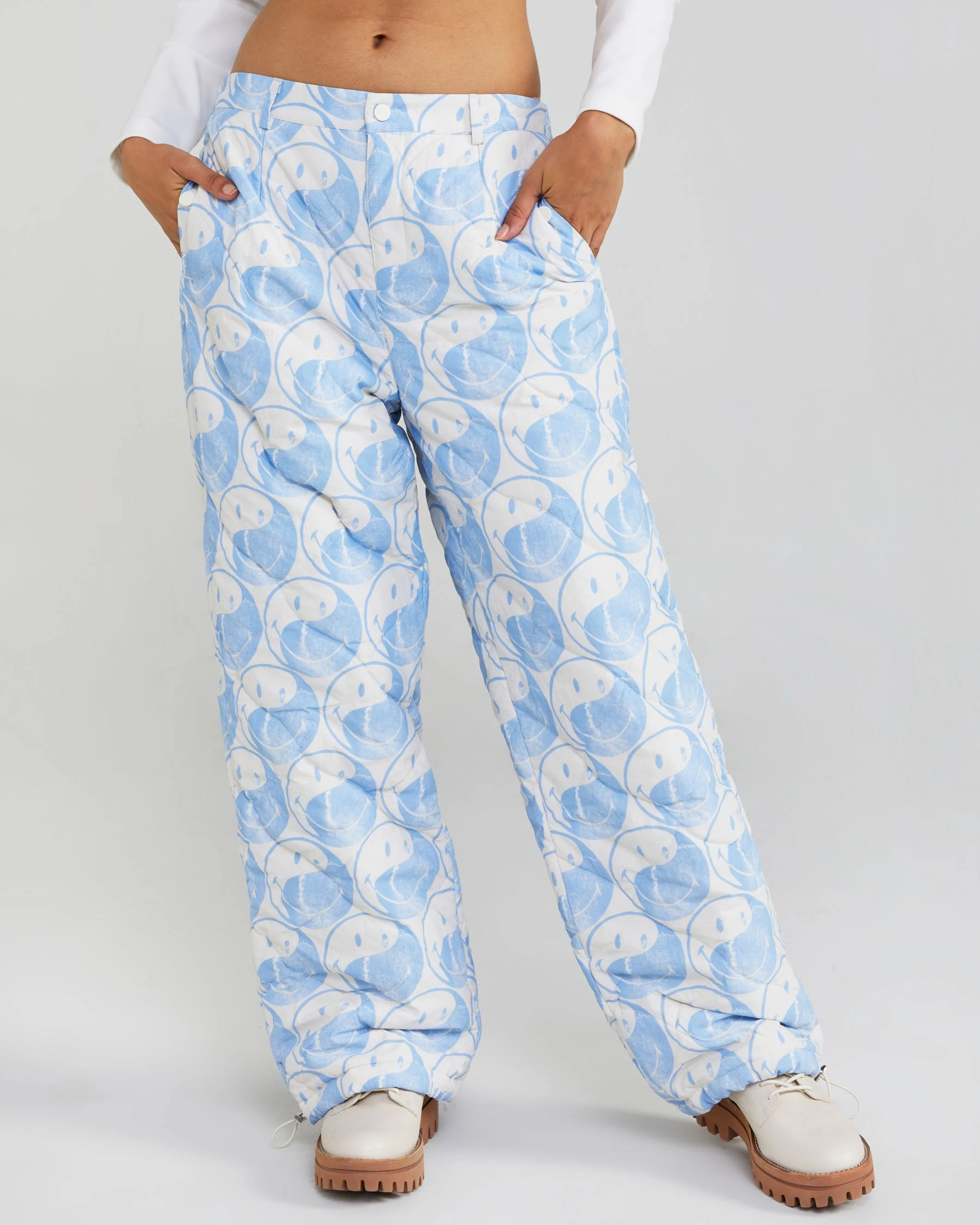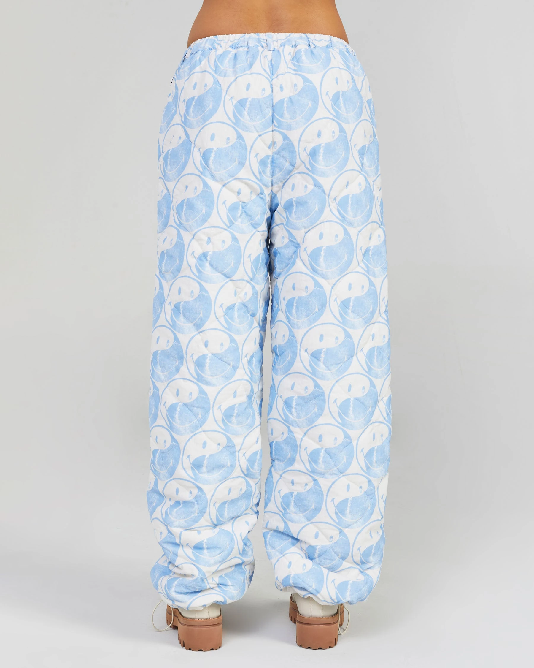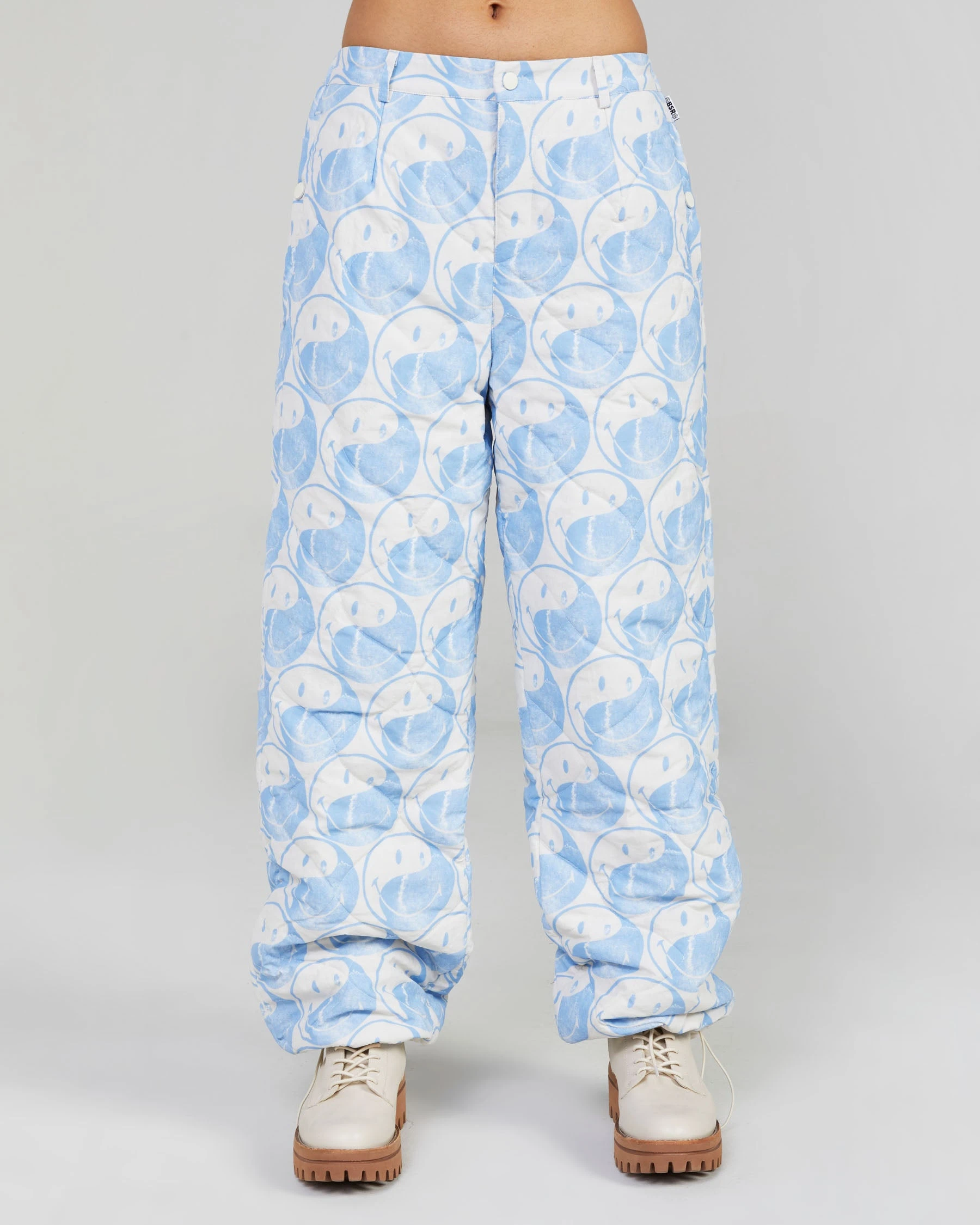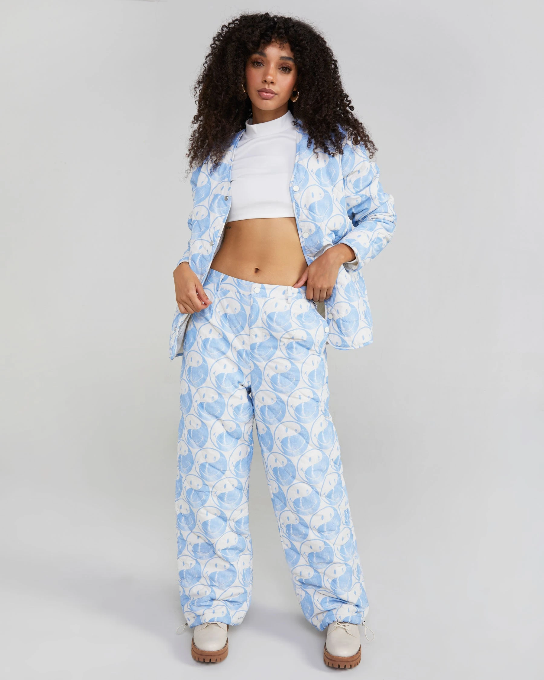 These quilted pants are the perfect pant for fall.. also theyย make us so happy and we’re sureย they will do the same for you. Our yin-yang quiltedย pants are lightly filledย andย have a mesh lining for ultimate comfort. These pants have a zipper and button and elastic on the back. On the bottom of the pant, we included a pull so you can wear the pants bunched up or straight.