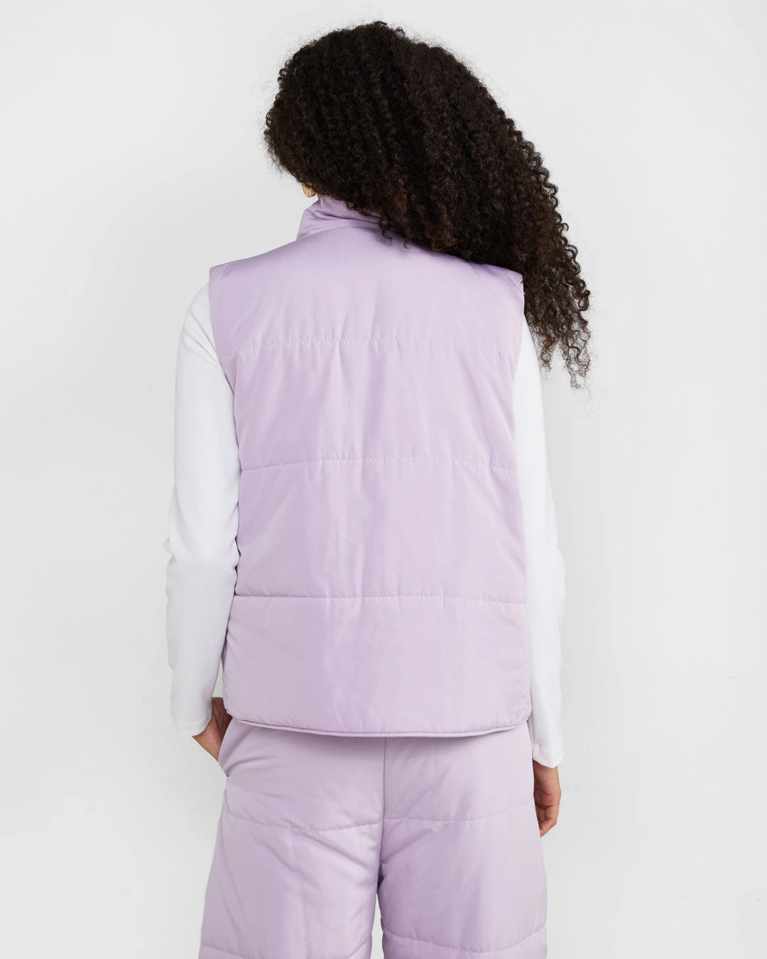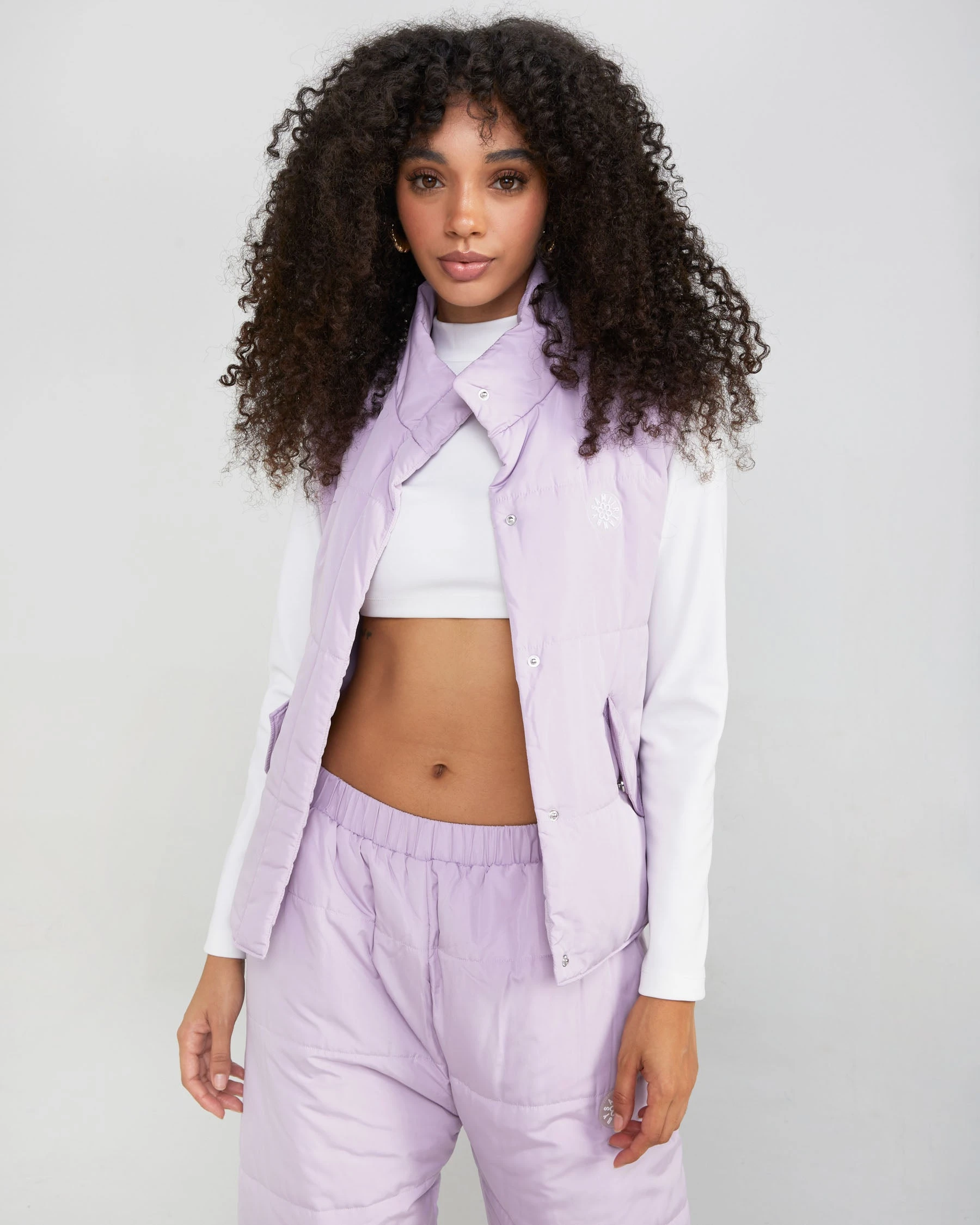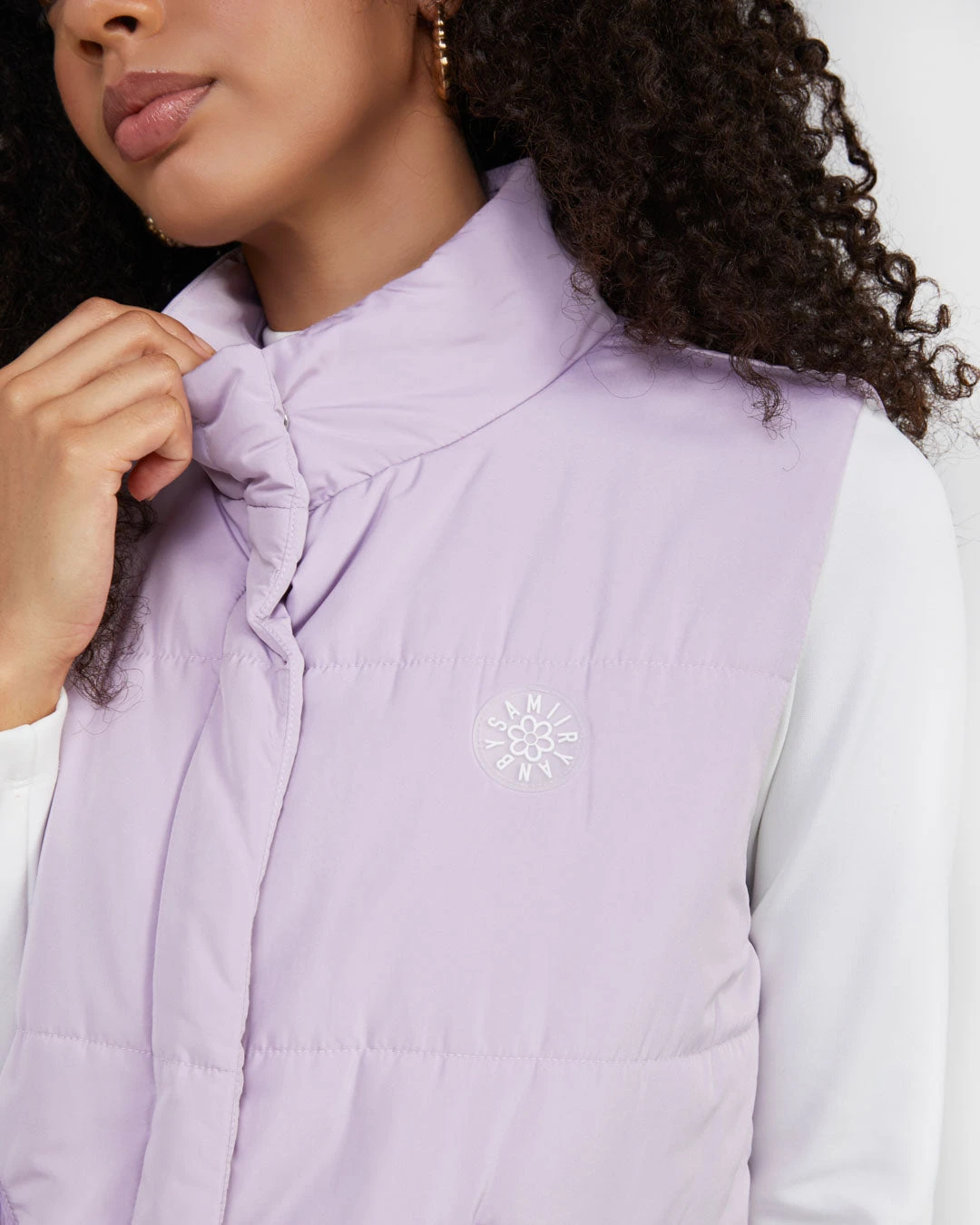 The tonal puffer vest is made from soft nylon fabric featuring a mock neck and a rubberized logo on the chest. The pockets and center include snap enclosures.Β