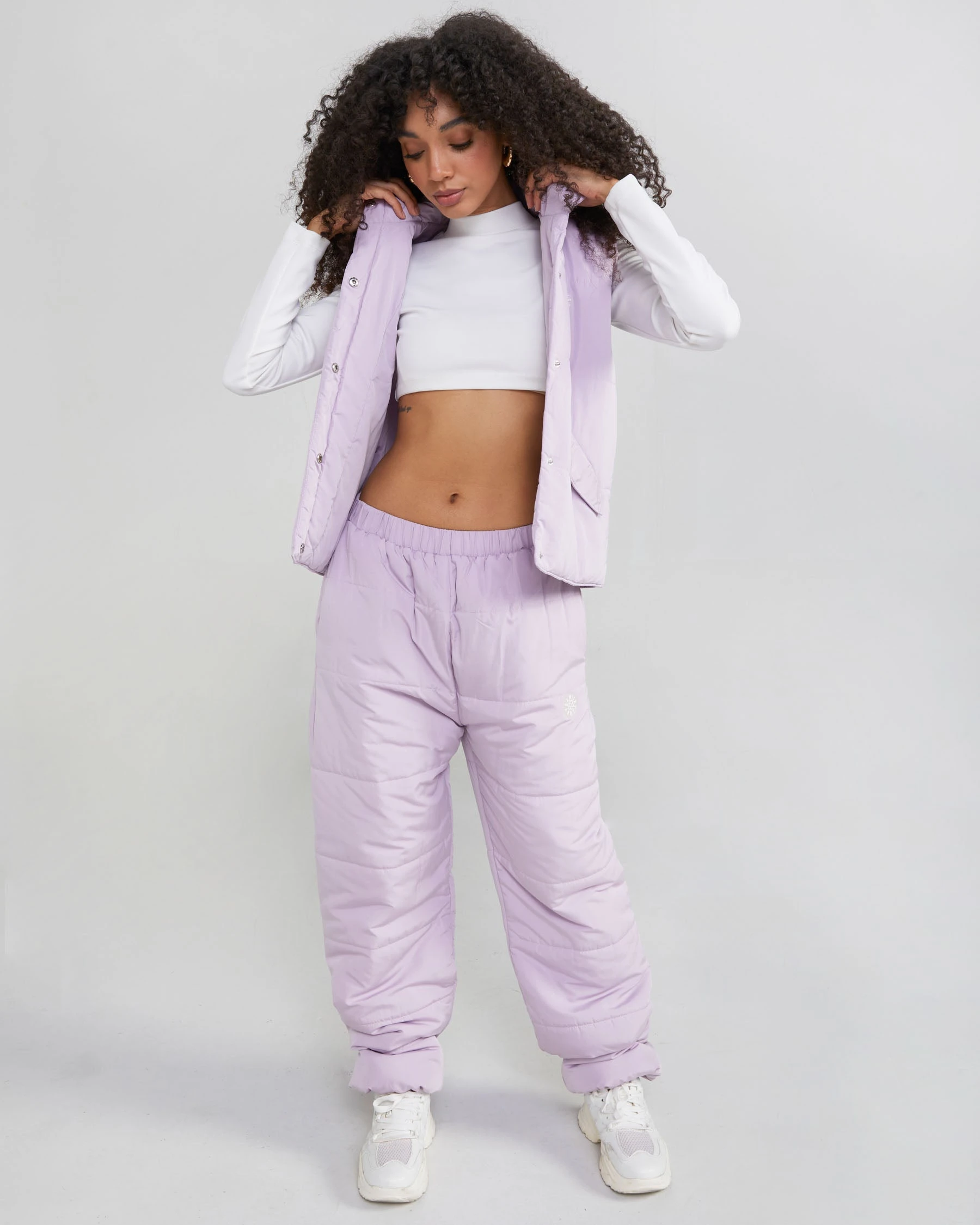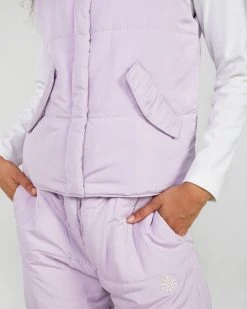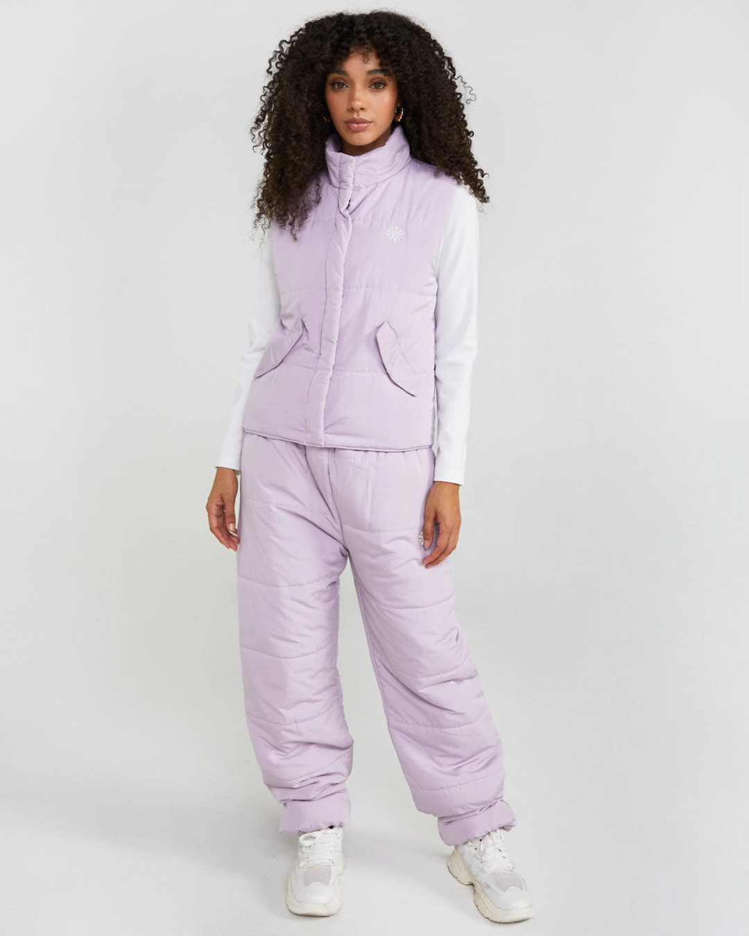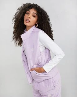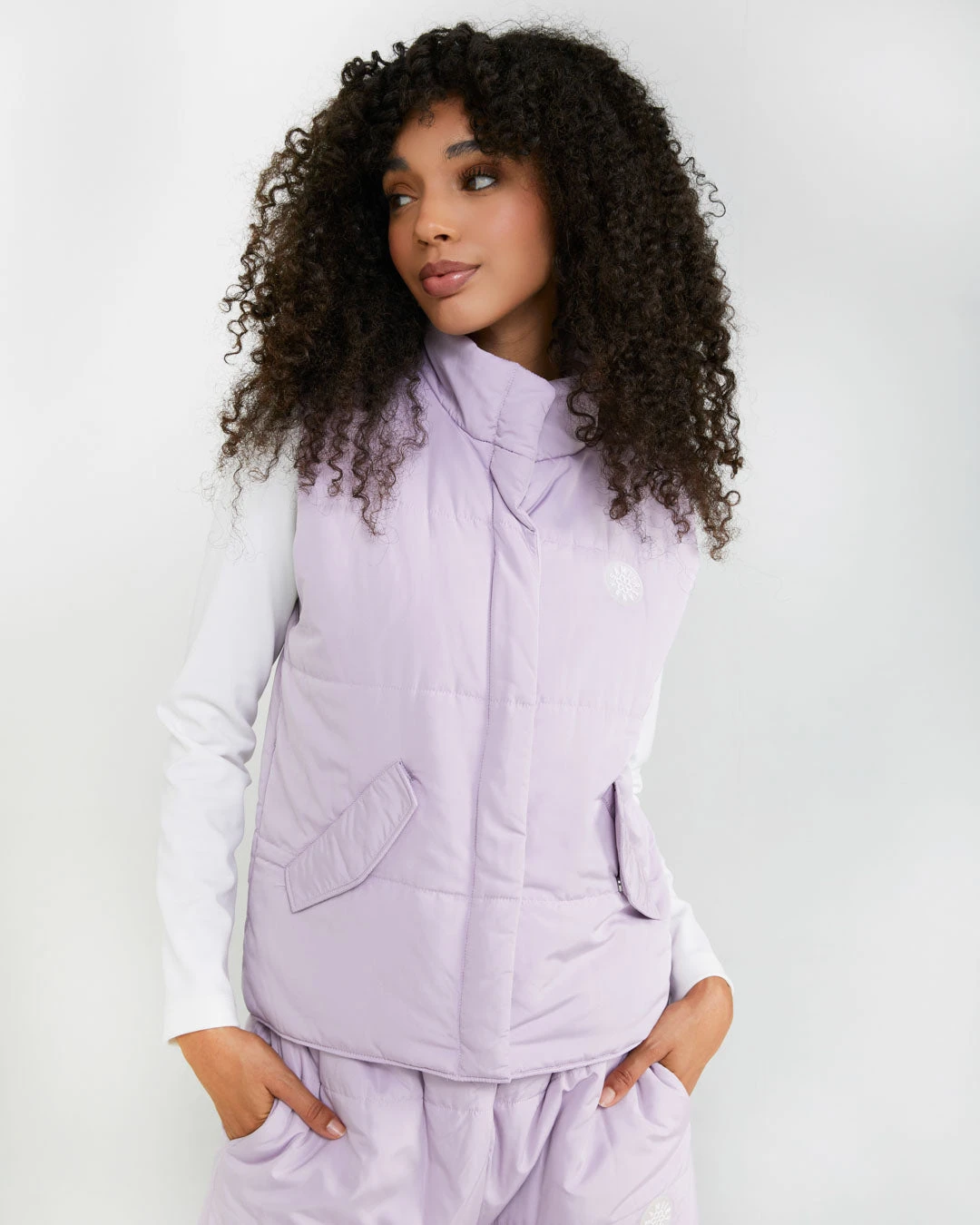 The tonal puffer vest is made from soft nylon fabric featuring a mock neck and a rubberized logo on the chest. The pockets and center include snap enclosures.Β